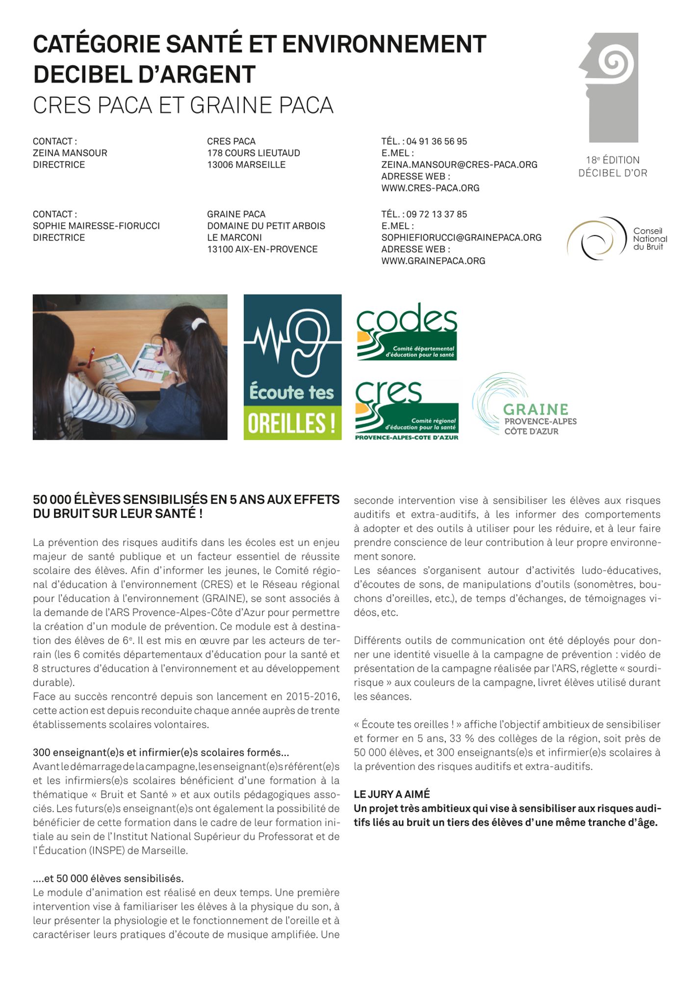 Le programme "Ecoute tes oreilles !" se déroule chaque année depuis 2016 dans 30 collèges volontaires de la région. Il est mené par le CRES et le Graine Provence-Alpes-Côte d’Azur, financé par l’ARS PACA, en partenariat étroit avec les rectorats d’Aix-Marseille et de Nice, le Centre d’information et de documentation du bruit, les CoDES de la région, ainsi que les structures de l’éducation à l’environnement et au développement durable.