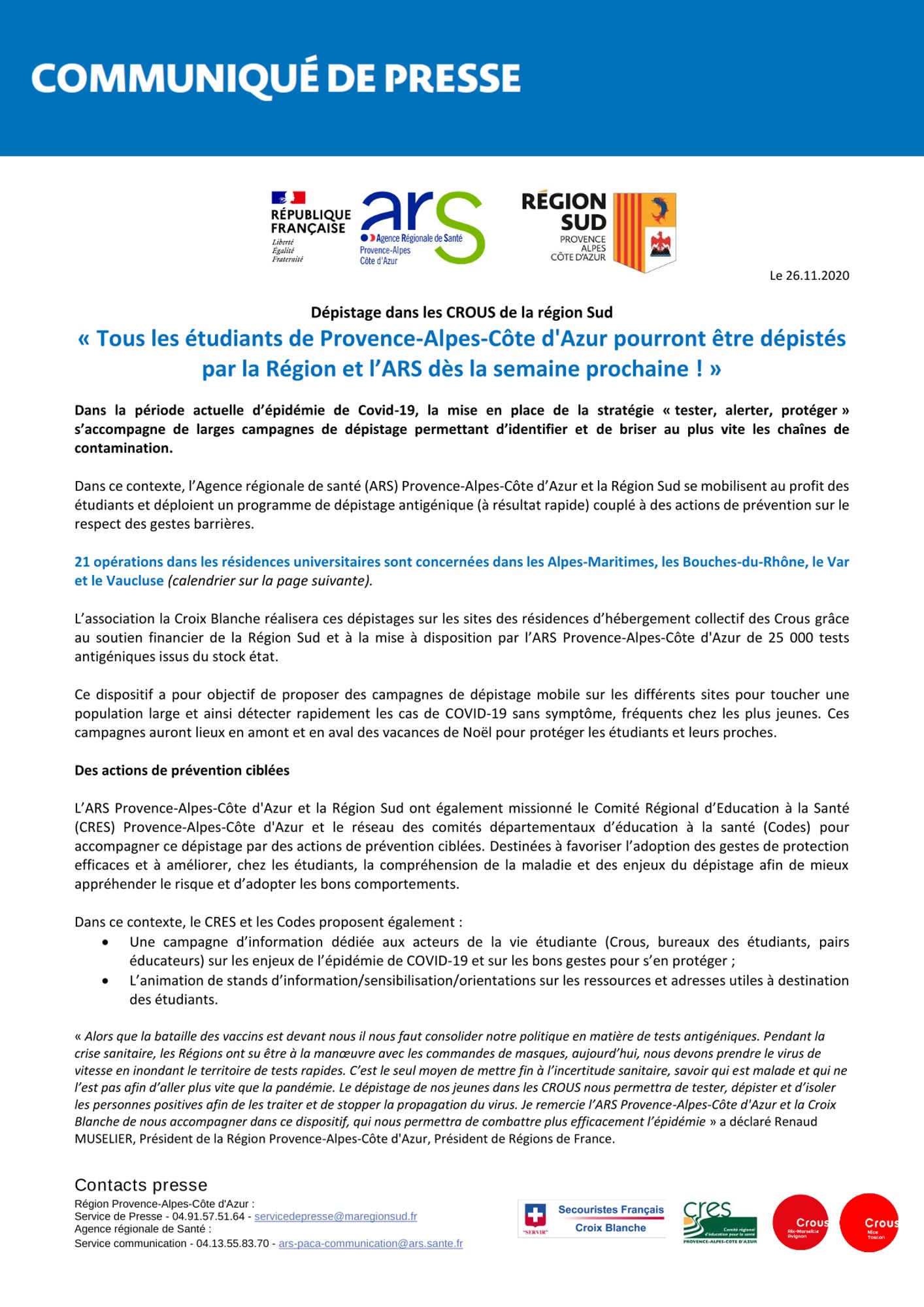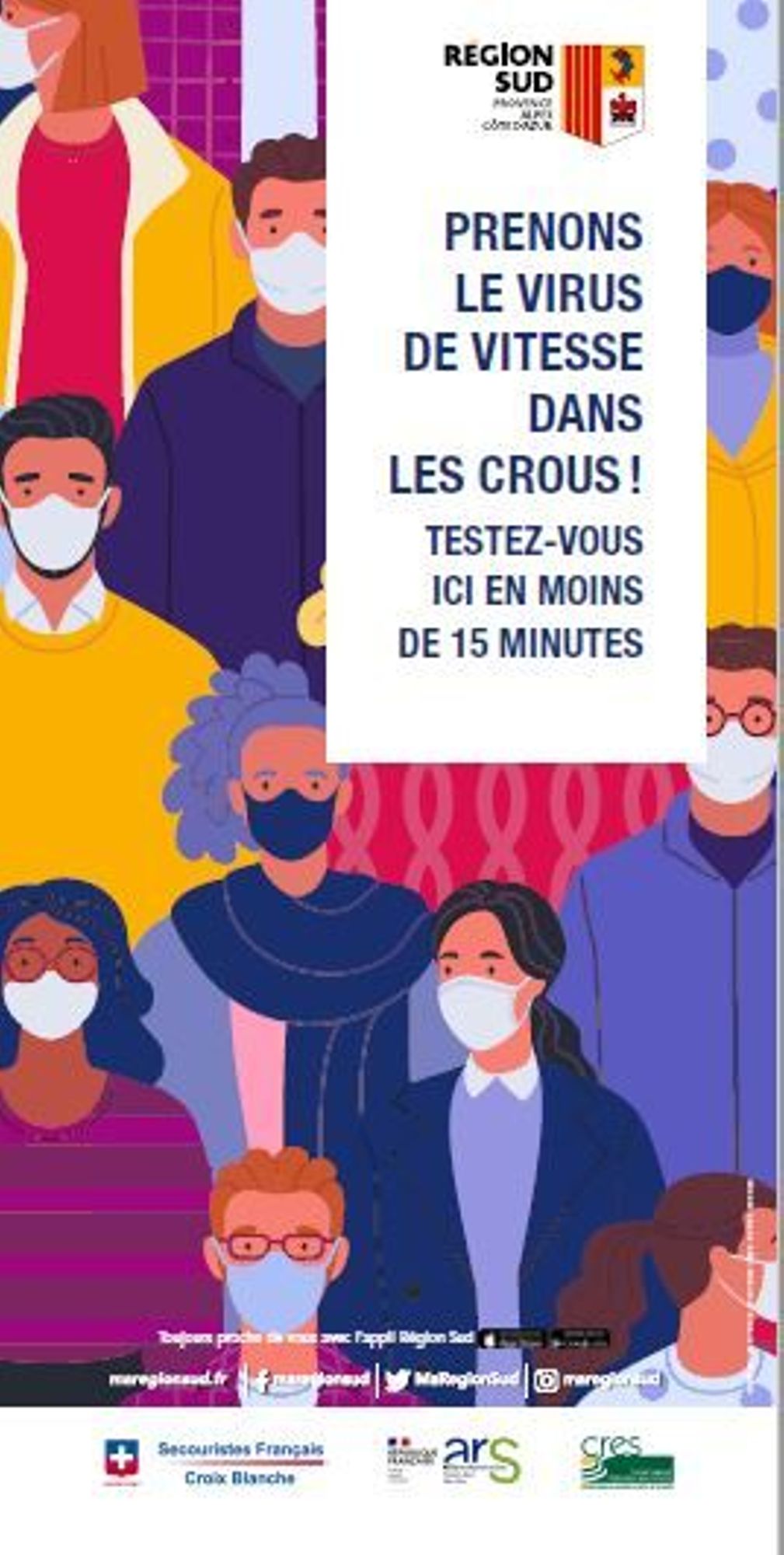 La Région Sud et l’ARS PACA se mobilisent au profit des étudiants et déploient un programme de dépistage antigénique (à résultat rapide) couplé à des actions de prévention sur le respect des gestes barrières.
