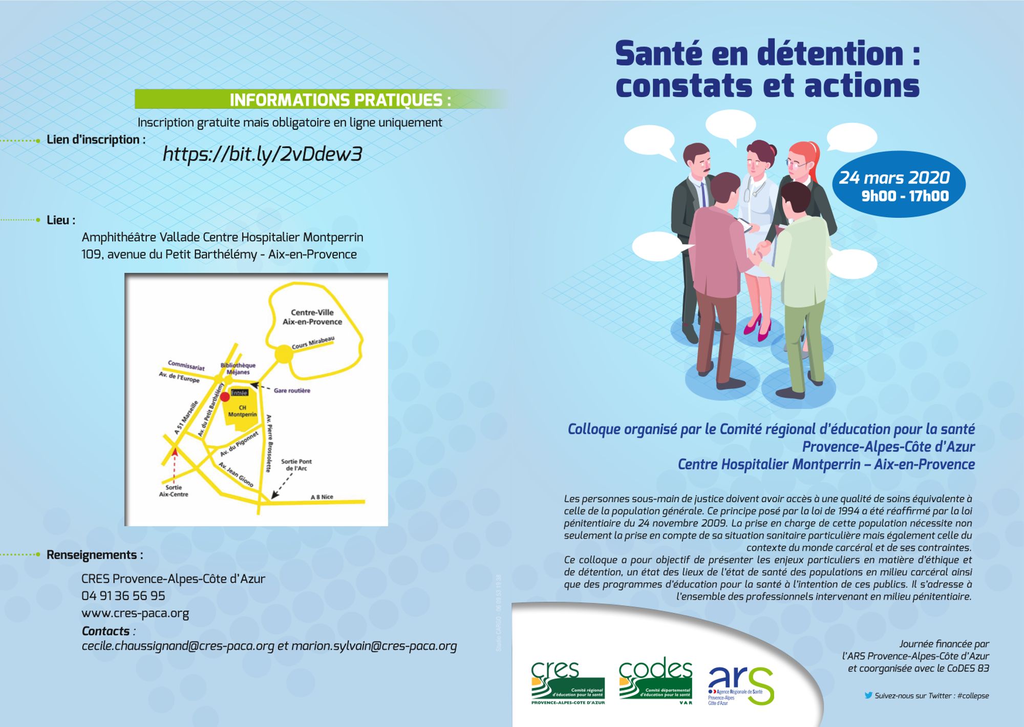 Le CRES et l’ARS Provence-Alpes-Côte d'Azur, en partenariat avec le CoDES 83, organisent le mardi 24 mars 2020 un colloque sur le thème : "Santé en détention : constats et actions" à Aix-en-Provence.