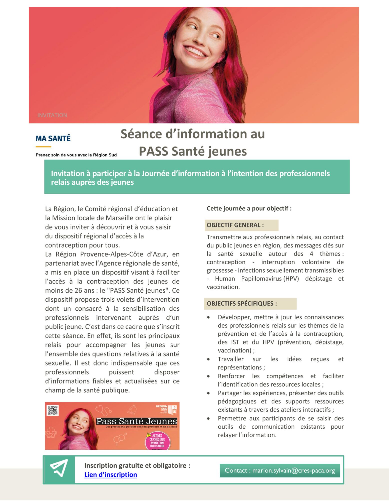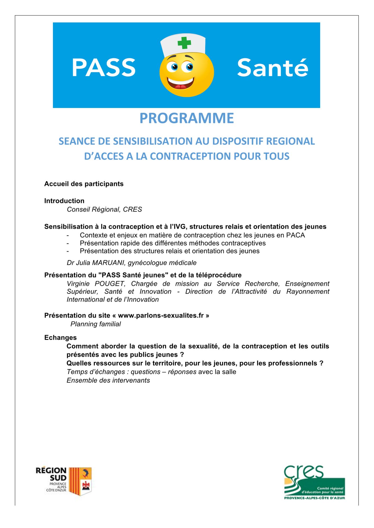 La Région Provence-Alpes-Côte d'Azur et le CRES proposent plusieurs fois par an des séances de sensibilisation et d’accompagnement au dispositif régional d’accès à la contraception pour tous, le Pass santé Jeunes, pour les professionnels-relais exerçant auprès des jeunes de la région.