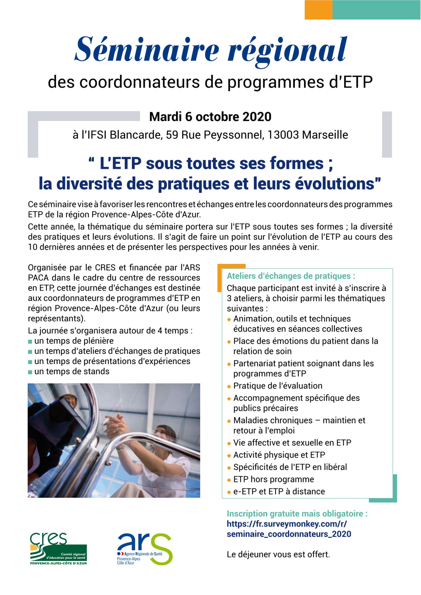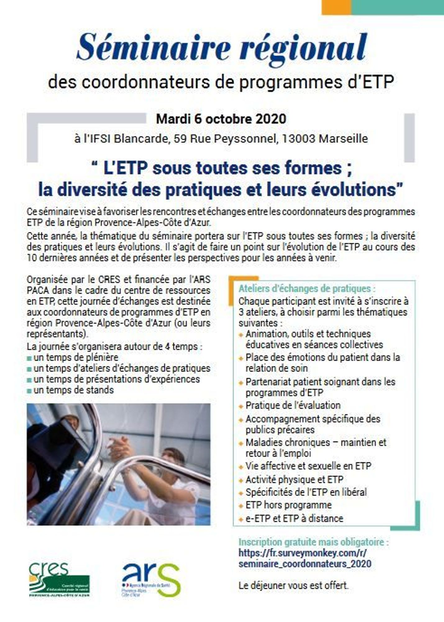 Le séminaire portera sur le thème : « L’ETP sous toutes ses formes, la diversité des pratiques et leurs évolutions » et aura pour objectif de favoriser les échanges entre les coordonnateurs des programmes ETP de la région Provence-Alpes-Côte d’Azur.