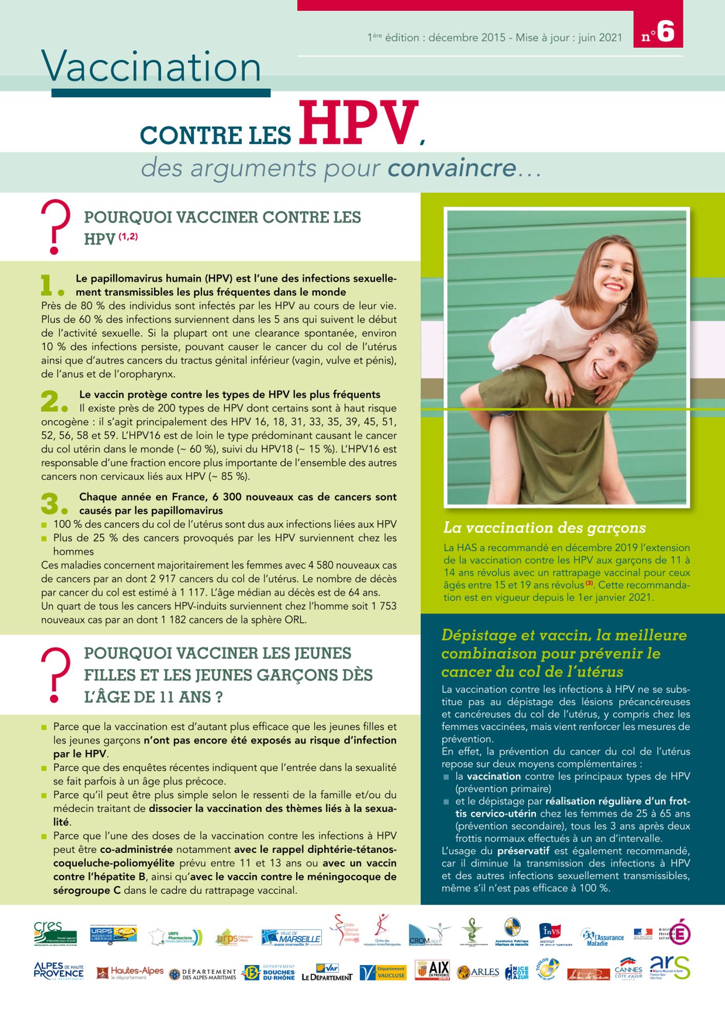La fiche argumentaire du CRES et de ses partenaires sur les HPV vient d'être mise à jour. Elle mentionne notamment l'extension de la vaccination aux garçons et les dernières données d'efficacité sur la prévention du cancer du col de l'utérus.