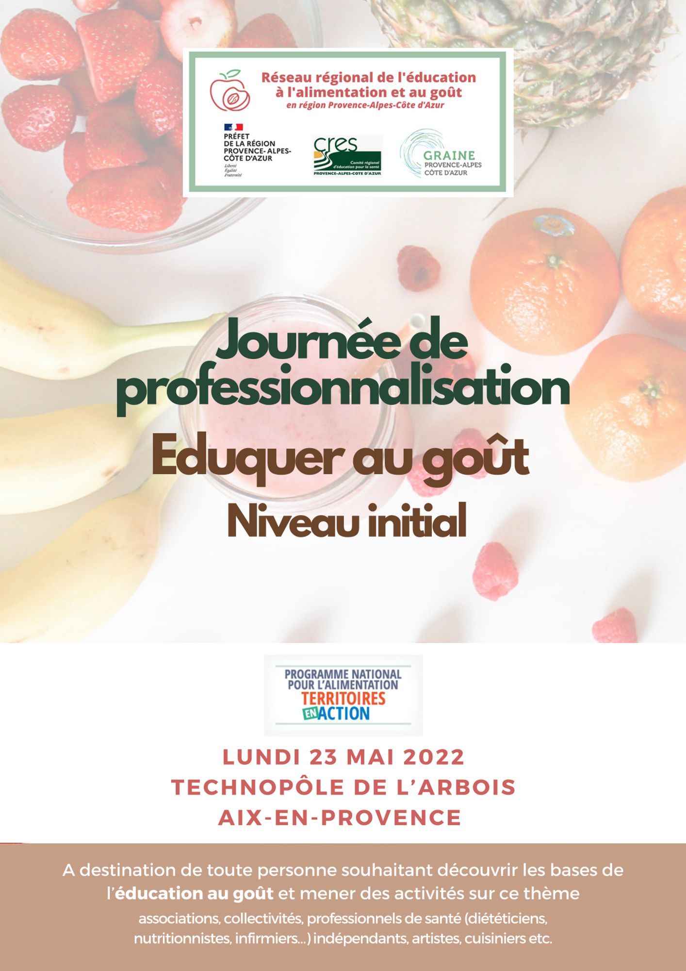 La première journée de professionnalisation "Eduquer au goût – niveau initial" se tiendra le lundi 23 mai 2022 au Technopôle de l’Arbois, à Aix-en-Provence.