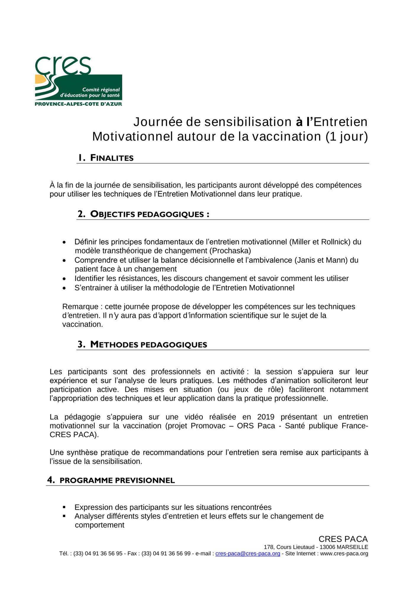 Le CRES organise une journée de sensibilisation à l'entretien motivationnel en vaccination, le 7 juin 2022, de 9h30 à 17h00, en présentiel dans ses locaux, 178 Cours Lieutaud à Marseille, animée par Pierre Sonnier, formateur et pharmacien.