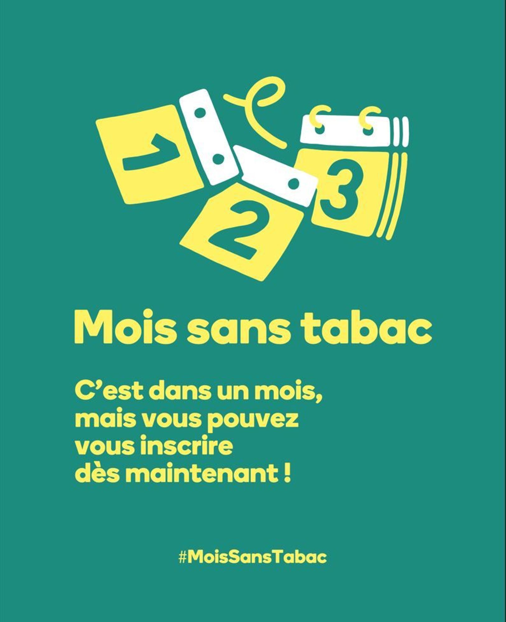 Mois sans tabac démarre dans un mois ! Mois sans tabac, c'est dans un mois! Mais il est déjà possible de s'inscrire et de commander son kit anti tabac sur https://mois-sans-tabac.tabac-info-service.fr/ Quant aux partenaires, c'est ici que se commandent les outils https://partenaires-mois-sans-tabac.tabac-info-service.fr/
