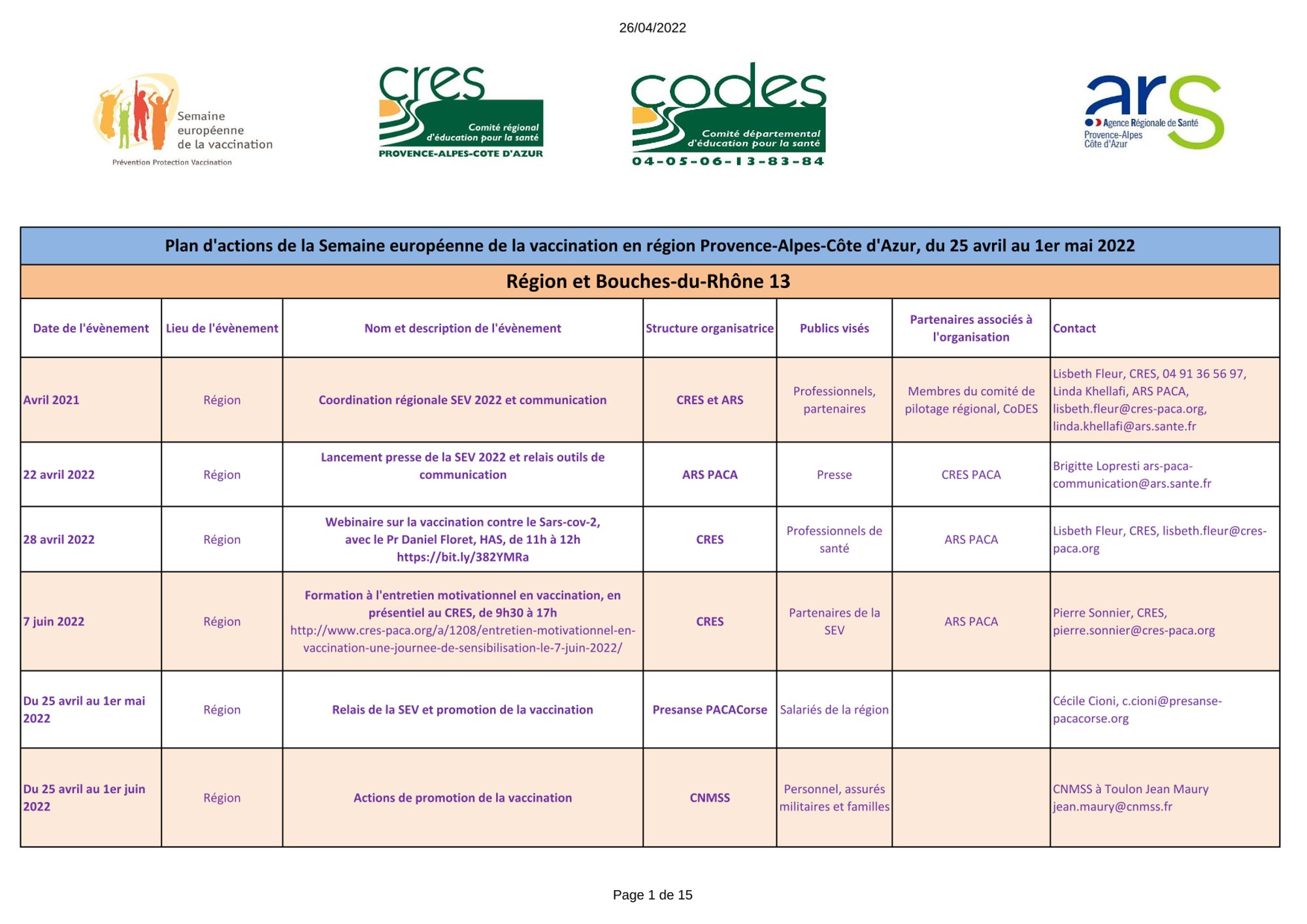 - La Sensibilisation des professionnels de santé de leur territoire par les maisons de santé de Gémenos le 27 avril, de Cavaillon (réunion d'information le 26 avril)