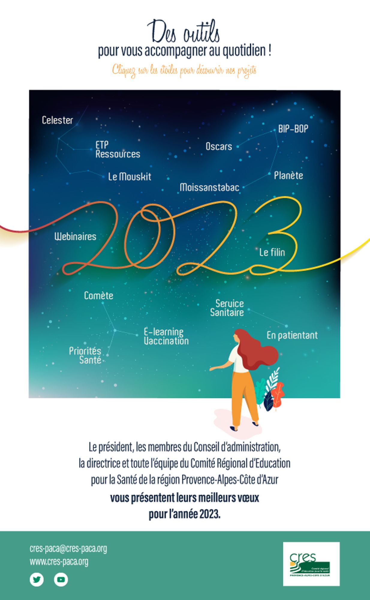 Le président, les membres du Conseil d'Administration, la directrice et toute l'équipe du CRES vous présentent leurs meilleurs voeux pour l'année 2023 !