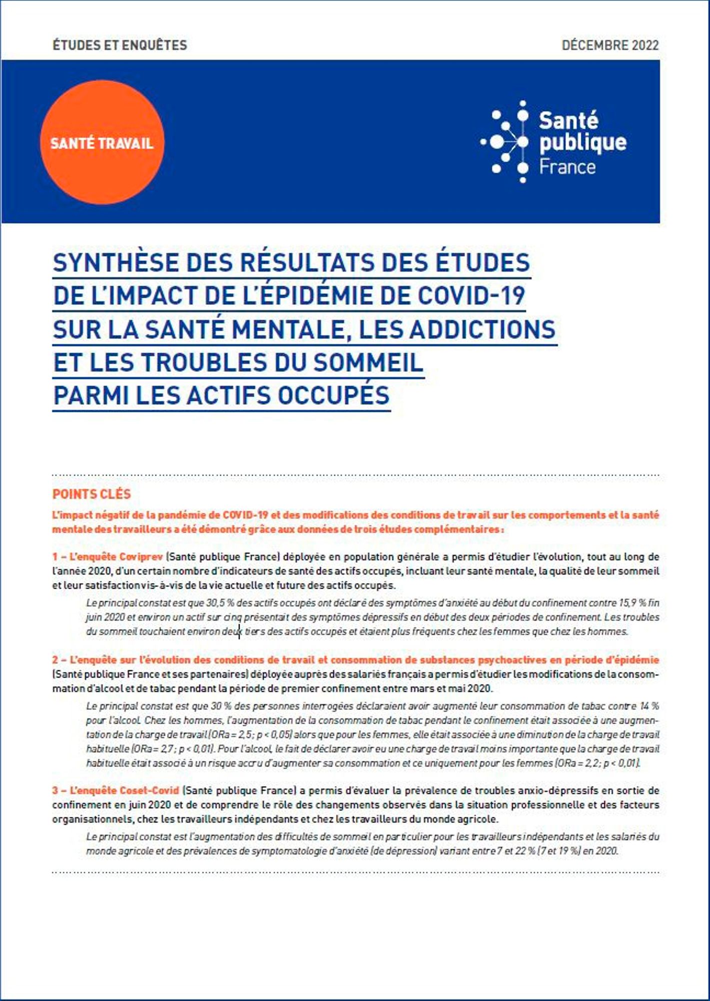 Santé publique France publie une synthèse des résultats de trois enquêtes réalisées en 2020 visant à estimer l’impact de la pandémie de COVID-19 sur les troubles anxio-dépressifs, la consommation d’alcool et de tabac parmi les travailleurs.