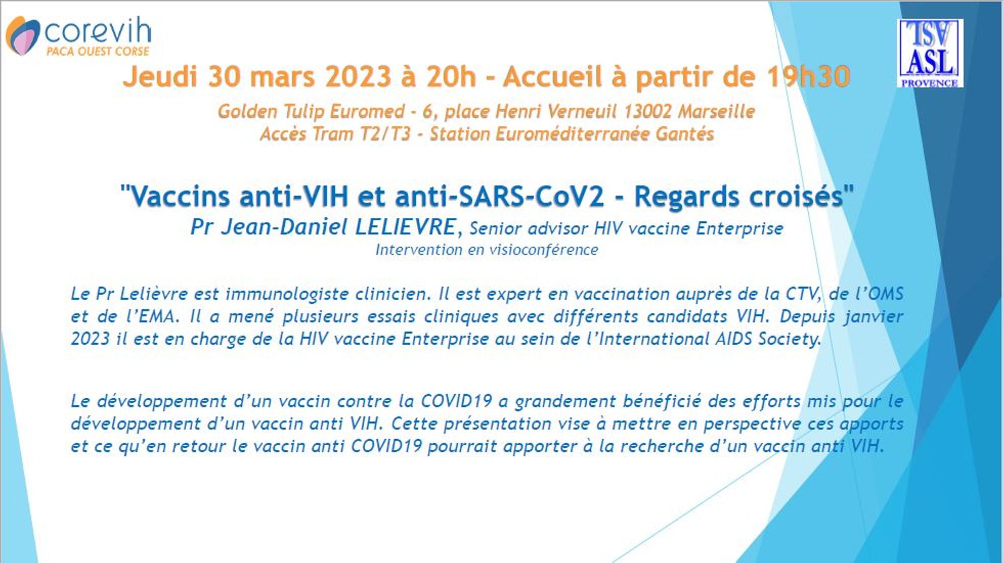 L’Association des Sidénologistes Libéraux de Provence et le Corevih POC organisent une soirée avec le Pr Jean-Daniel Lelièvre, Senior advisor HIV vaccine Enterprise à l’International AIDS Society. Le développement d’un vaccin contre la COVID19 a grandement bénéficié des efforts mis pour le développement d’un vaccin anti VIH. Cette présentation vise à mettre en perspective ces apports et ce qu’en retour le vaccin anti COVID19 pourrait apporter à la recherche d’un vaccin anti VIH.