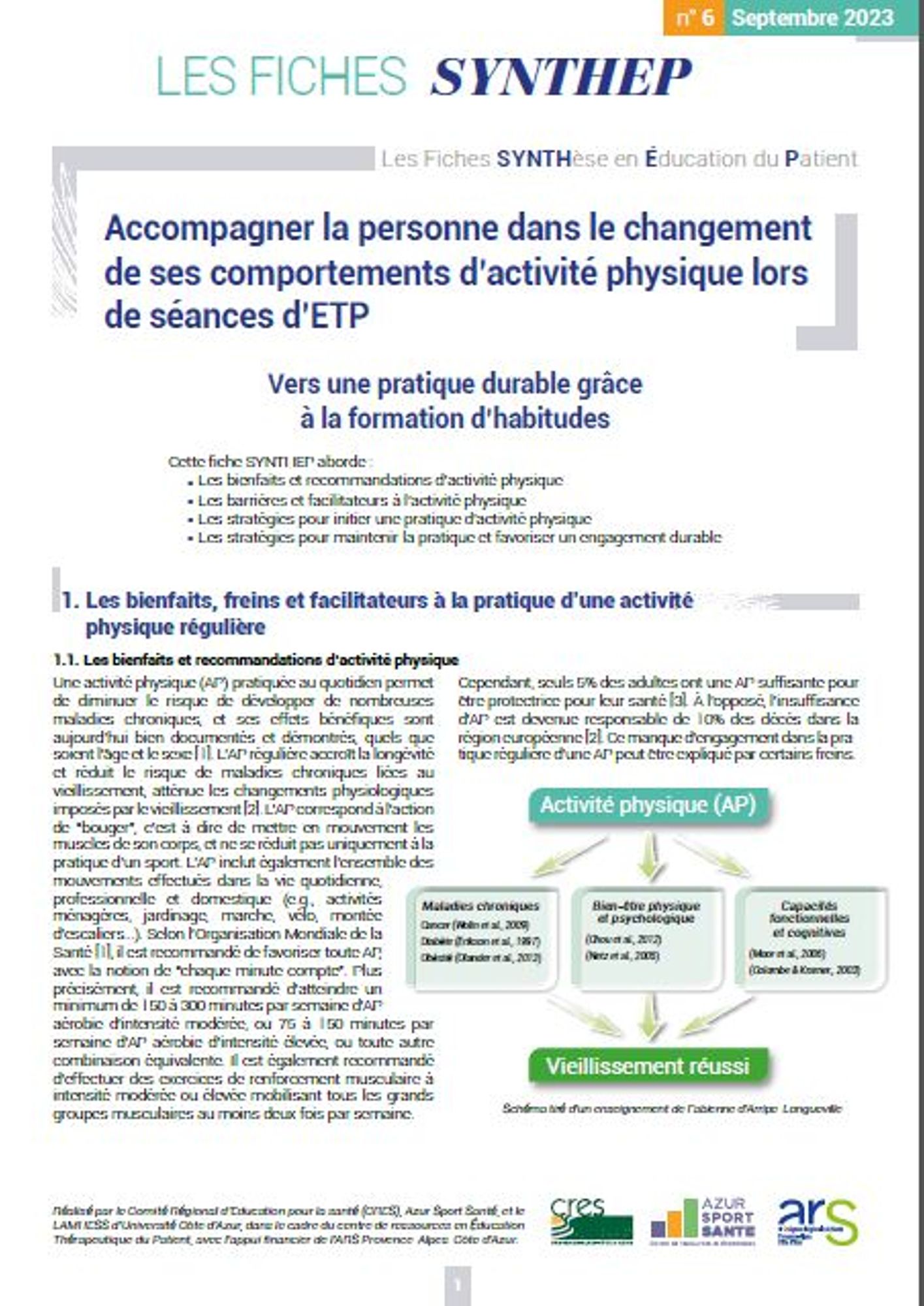 - Une sixième fiche Synthep sur le thème "Accompagner la personne dans le changement de ses comportements d'activité physique lors de séances d'ETP" : voir la fiche