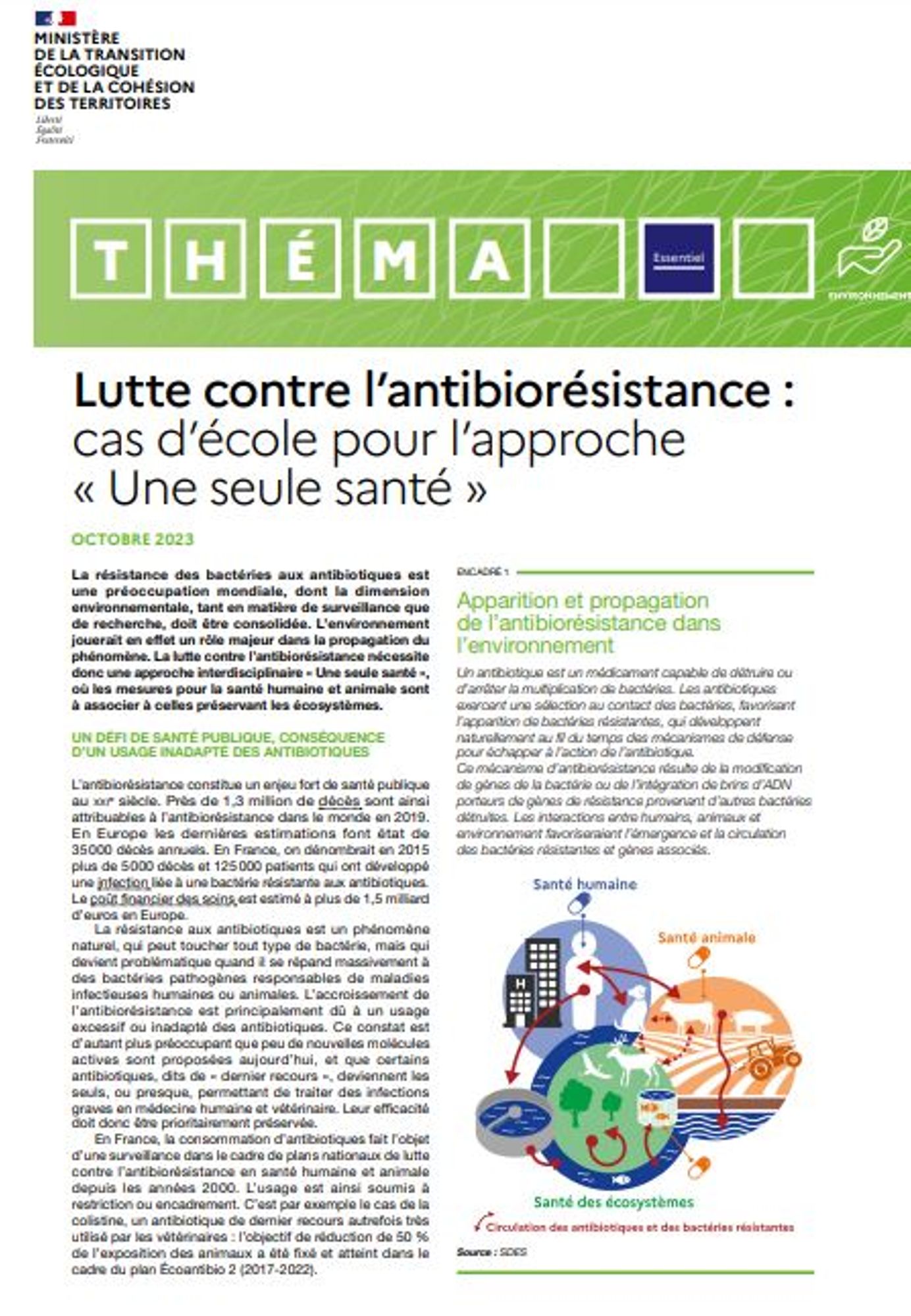 La résistance des bactéries aux antibiotiques est une préoccupation mondiale, dont la dimension environnementale, tant en matière de surveillance que de recherche, doit être consolidée. L’environnement jouerait en effet un rôle majeur dans la propagation du phénomène. La lutte contre l’antibiorésistance nécessite donc une approche interdisciplinaire « Une seule santé », où les mesures pour la santé humaine et animale sont à associer à celles préservant les écosystèmes.