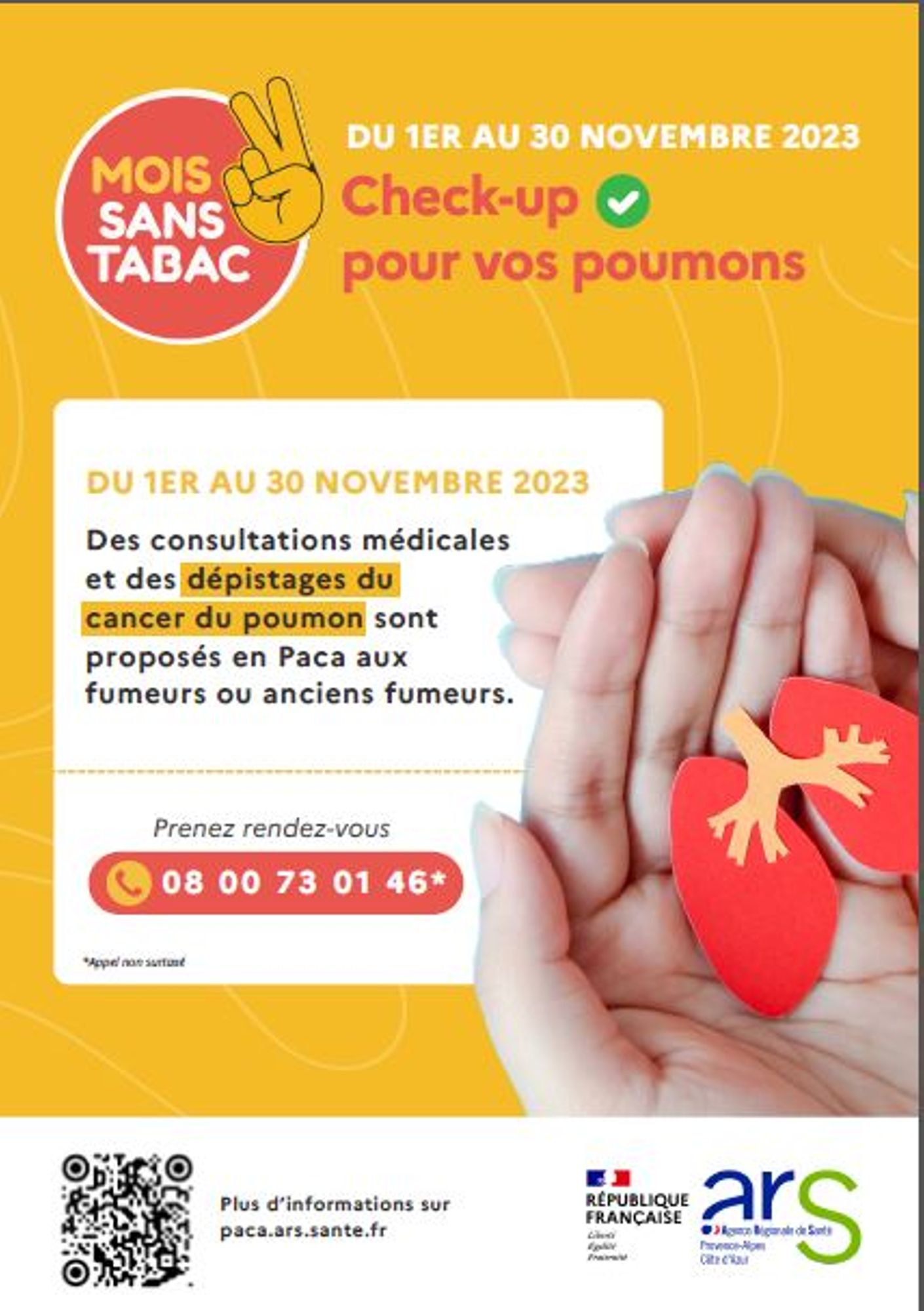 A cette occasion, et durant tout le mois de novembre, l'ARS PACA déploie, en lien avec huit établissements de la région, une opération expérimentale "Check up pour vos poumons" à destination des fumeurs (et ex fumeurs). Grâce à une plateforme téléphonique (0800 73 01 46), des consultations médicales et des dépistages du cancer du poumon peuvent être proposés.