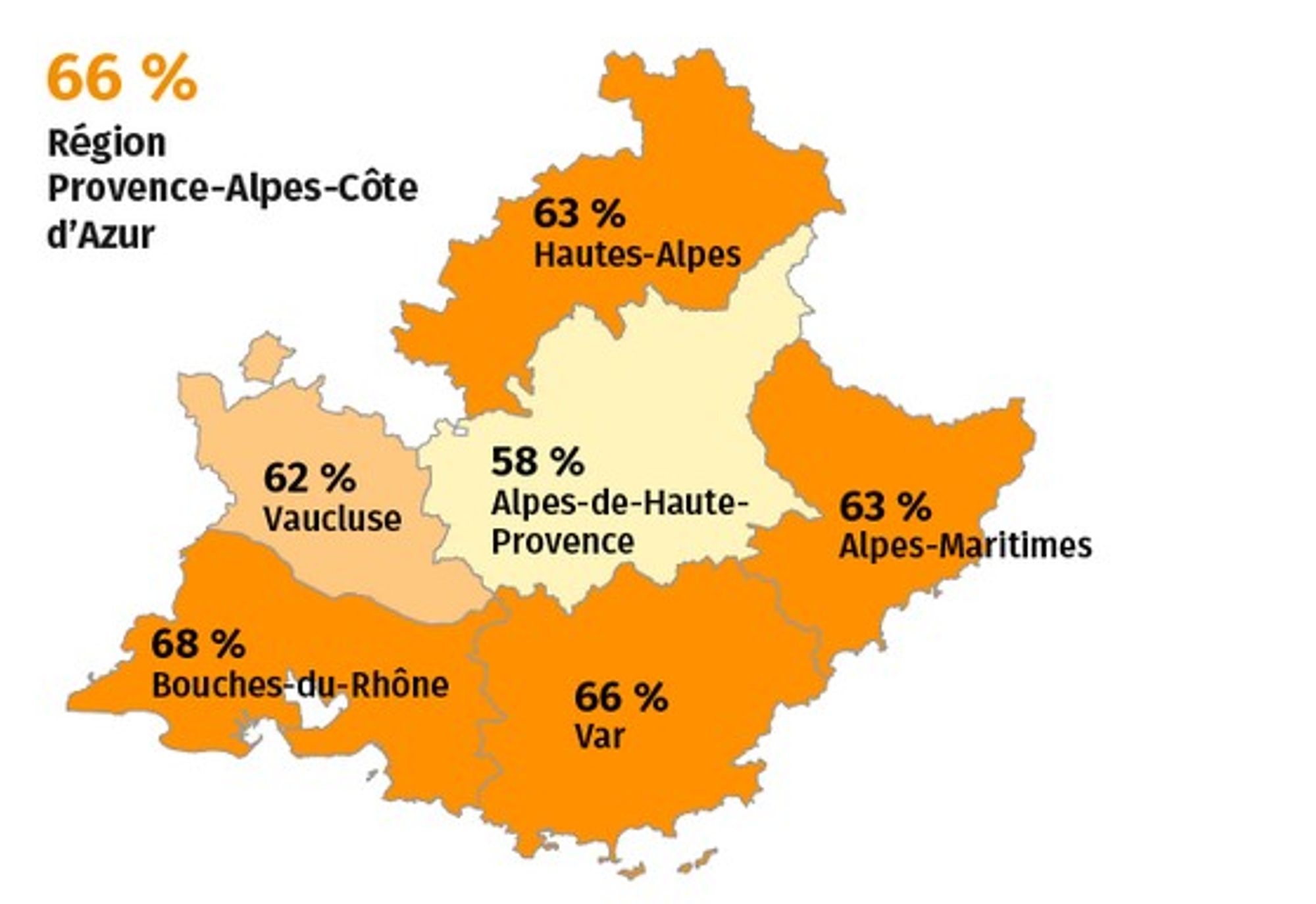 Dans la cohorte des nouveau-nés en 2019, la couverture vaccinale par le ROR (deux doses) à l'âge de 19 mois atteint 66 % dans la région et varie de 58 % dans le département des Alpes de Haute-Provence, à 68 % dans le département des Bouches-du-Rhône.