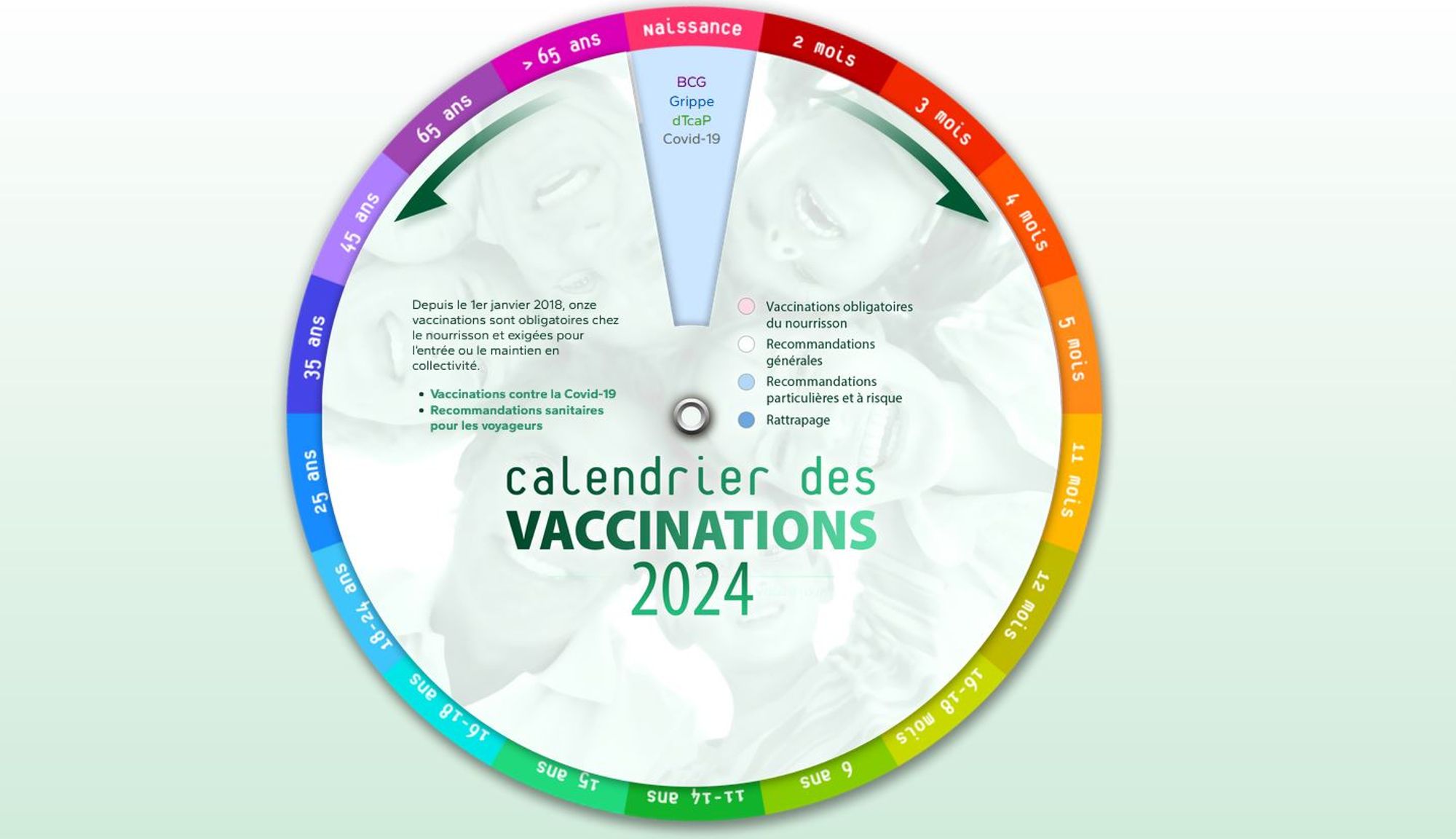 Cette version interactive du calendrier vaccinal 2024 permet en un clic de vérifier les vaccinations pour lesquelles il convient d'être à jour, en fonction de sa tranche d'âge.