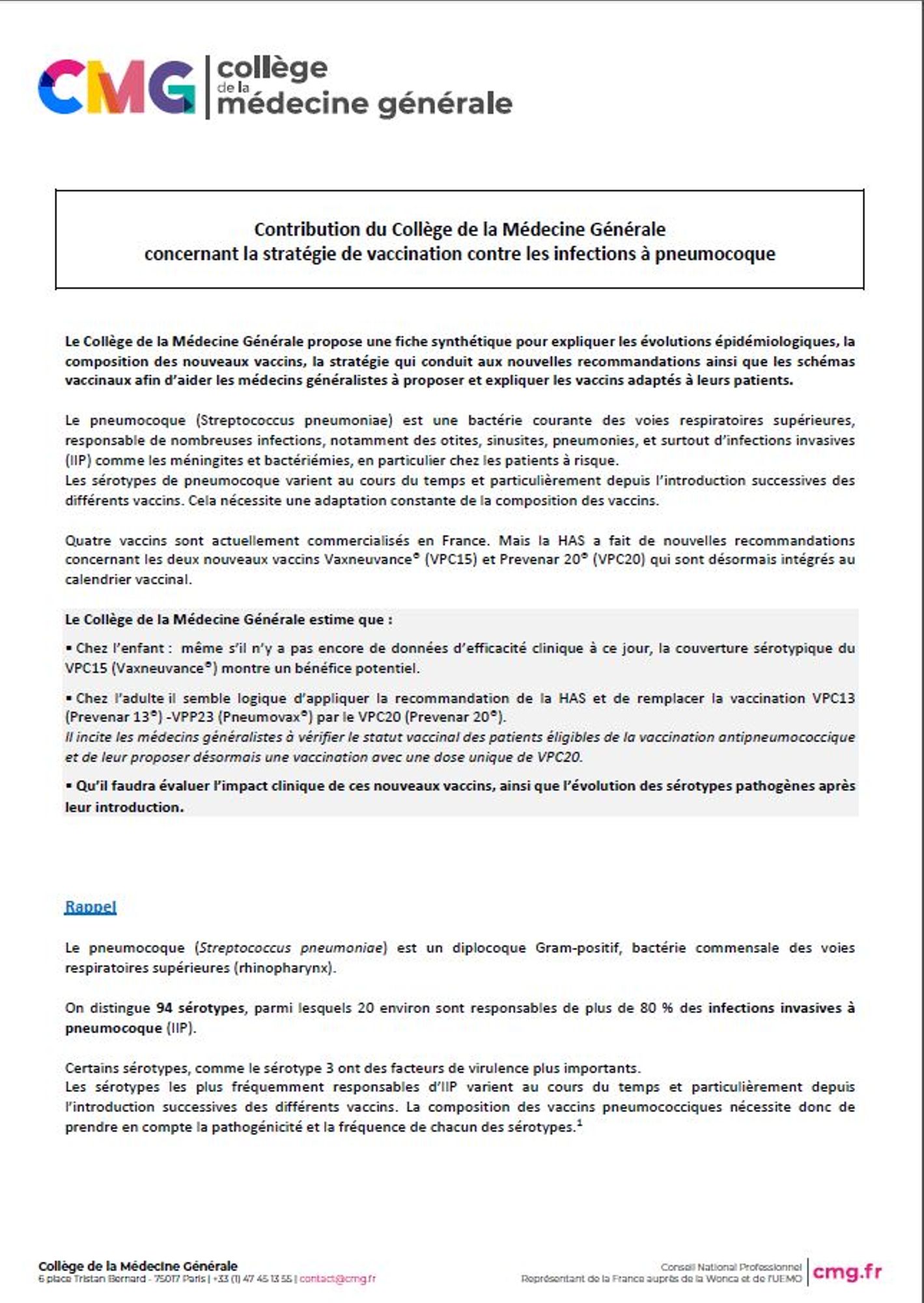 Pour comprendre les évolutions épidémiologiques, la composition des nouveaux vaccins, la stratégie qui conduit aux nouvelles recommandations ainsi que les différents schémas vaccinaux, le Collège de la Médecine Générale met à disposition une fiche synthétique afin d’aider les médecins généralistes à proposer et expliquer les vaccins adaptés à leurs patients.