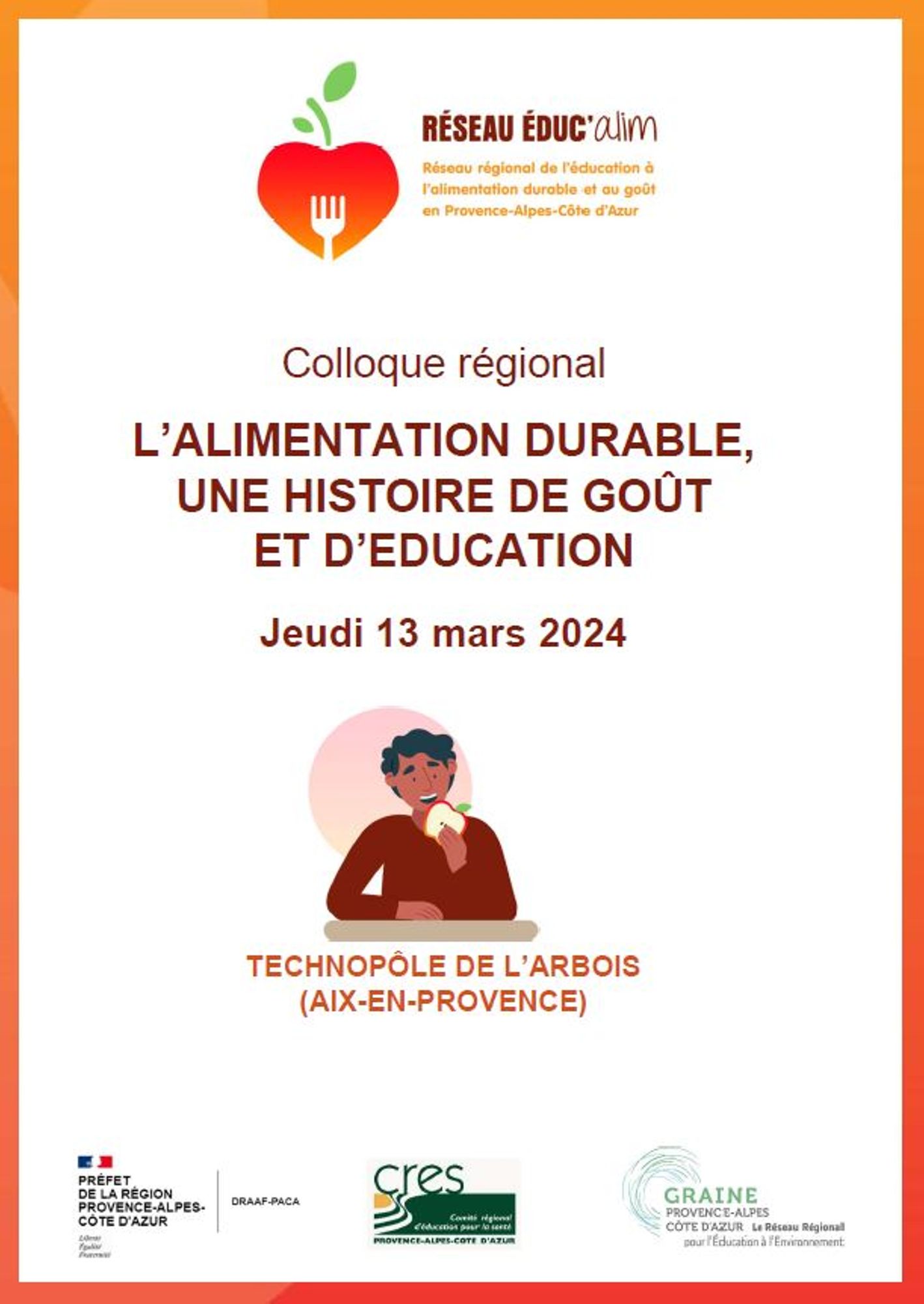 Ce colloque est organisé dans le cadre du Réseau régional de l’éducation à l’alimentation durable et au goût en région Provence-Alpes-Côte d’Azur (Réseau EDUC’alim), financé par la DRAAF et porté par le Comité régional d’éducation pour la santé (CRES) et le Réseau régional d’éducation pour l’environnement (GRAINE) Provence-Alpes-Côte d'Azur.