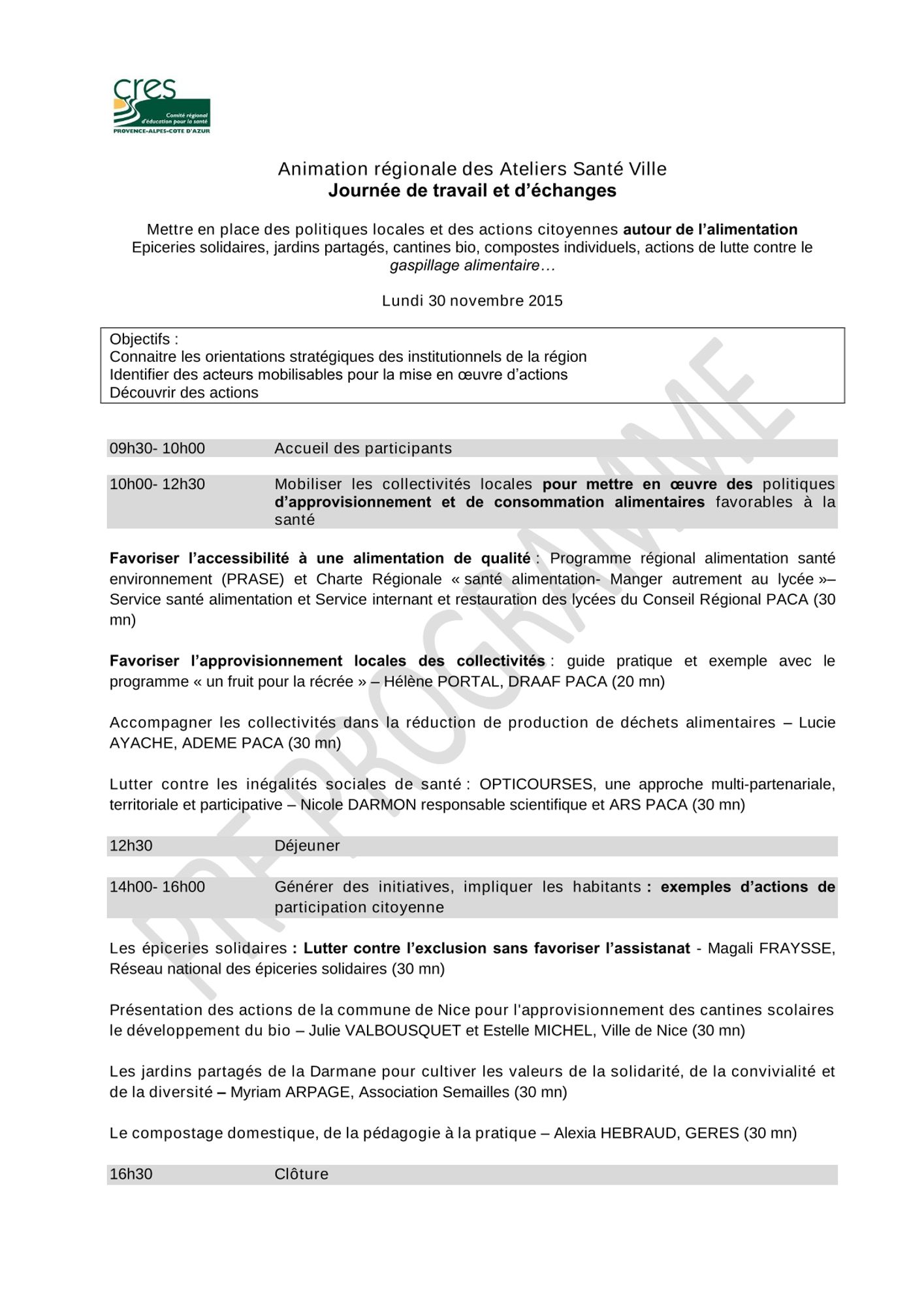 Dans le cadre de sa mission d’animation régionale des ASV, le CRES a organisé le 30 novembre 2015, une journée de travail et d’échanges sur le thème « Mettre en place des politiques locales et des actions citoyennes autour de l’alimentation : épiceries solidaires, jardins partagés, cantines bio, composts individuels, actions de lutte contre le gaspillage alimentaire… »