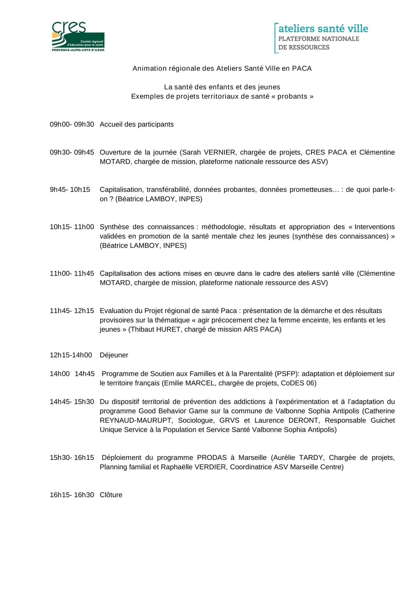 La dernière journée d'animation régionale des ASV de la région s'est tenue le 14 juin 2016 à Marseille, sur le thème : la santé des enfants et des jeunes, exemples de projets territoriaux de santé « probants ». Objectif : définir, repérer et transférer des bonnes pratiques des projets territoriaux de santé.