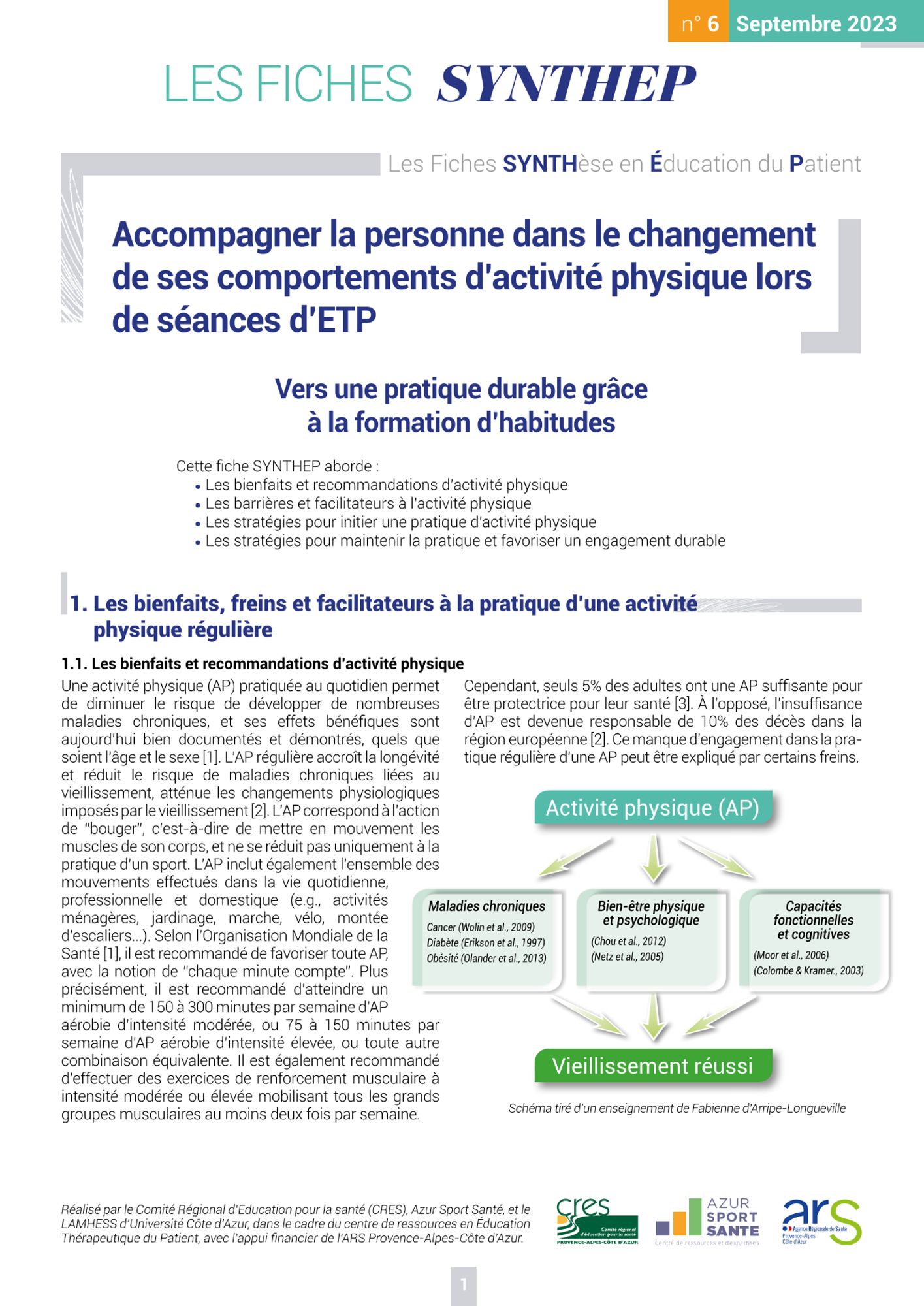 D'Arripe-Longueville Fabienne, Fournier Marion, Hayotte Meggy (et al.), Accompagner la personne dans le changement de ses comportements d’activité physique lors de séances d’ETP. Vers une pratique durable grâce à la formation d'habitudes, Les Fiches Synthep. Les fiches synthèse en éducation du patient, n° 6, 2023-01, 7 p.