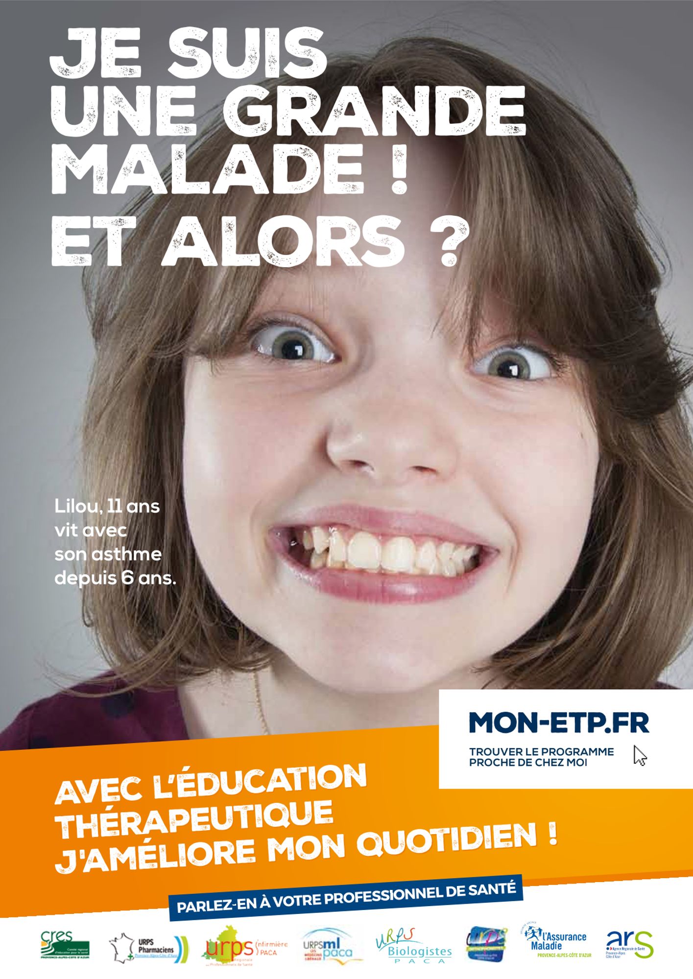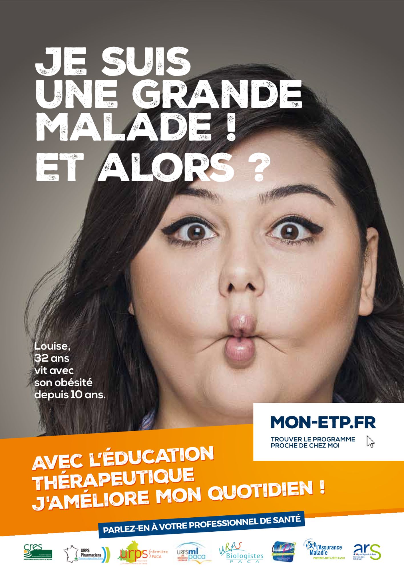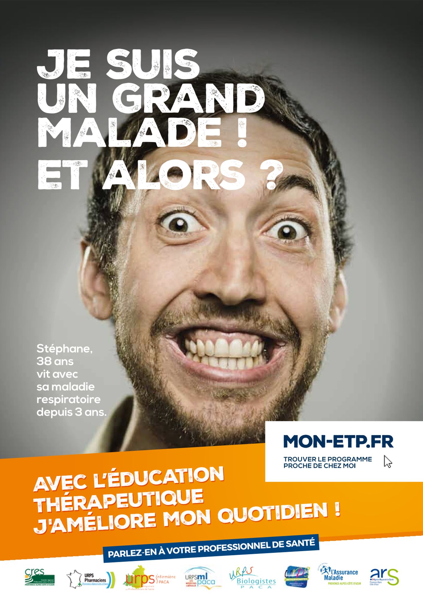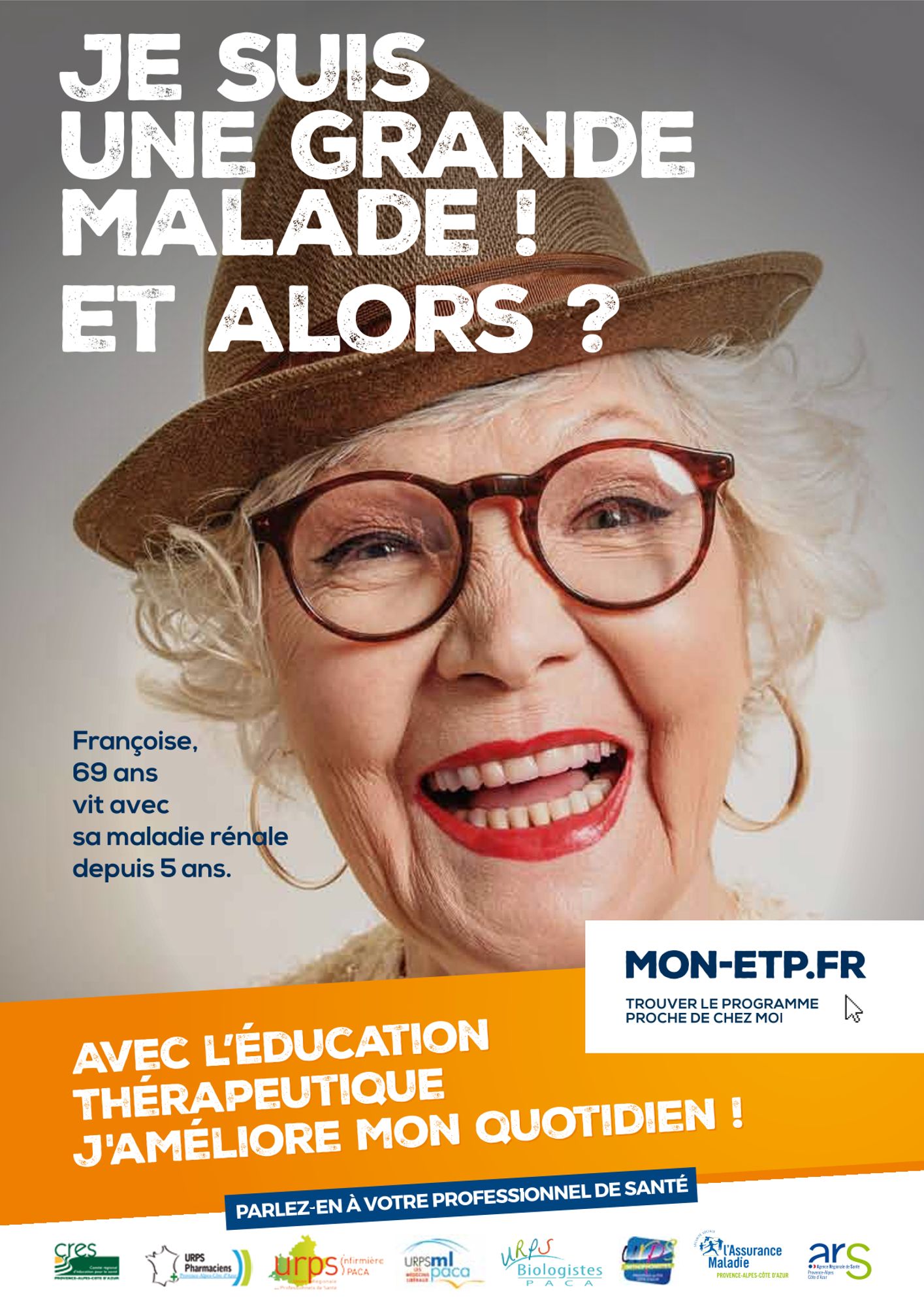 Sur un ton humoristique, la campagne décline une série de portraits de patients espiègles, ayant du recul sur leur maladie, illustrés par le message "Je suis un grand malade! Et alors?", accompagnés de la signature "Avec l'éducation thérapeutique j'améliore mon quotidien".