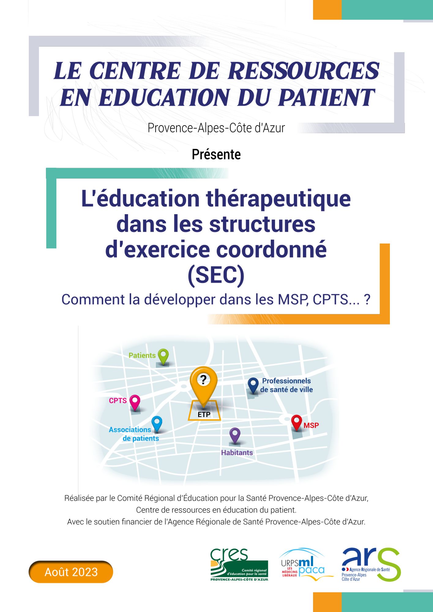 Ce guide méthodologique propose de fournir une aide aux équipes pour les accompagner dans le développement de l’ETP spécifiquement au sein des structures d’exercice coordonné. Il se compose de 5 parties : mieux appréhender les formats d’éducation thérapeutique au sein d’une SEC, comprendre le rôle pouvant être joué par des professionnels ayant un profil spécifique, favoriser l’adhésion des professionnels au sein d’une SEC, favoriser le recrutement des patients et renforcer le partenariat patient au sein d’un programme, favoriser le développement de l’ETP dans une SEC – scénario catastropheLe Certificat universitaire (CU) et le Diplôme universitaire (DU) “Patients experts-maladies chroniques” de l’Université Aix-Marseille existent depuis 10 ans. L’objectif de cette enquête est de recenser l’activité des patients experts à la suite du CU/DU, de comprendre leur implication dans diverses activités, d'analyser les leviers et les difficultés rencontrées dans leur investissement en tant que patient expert.