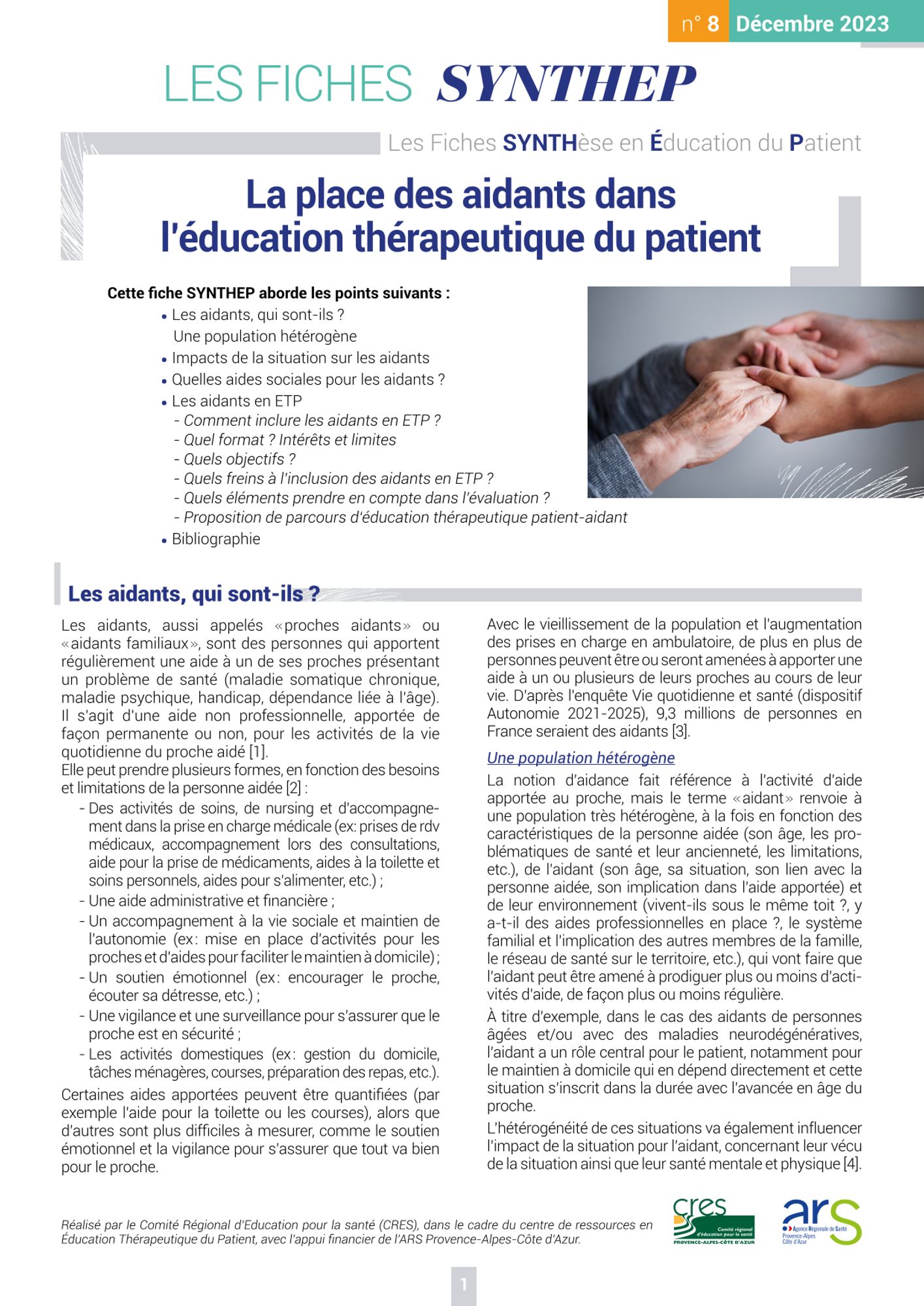 Vioulac Christel, Sonnier Pierre, Saugeron Benoit. La place des aidants dans l’éducation thérapeutique du patient. Les Fiches Synthep. Les fiches synthèse en éducation du patient, n° 8, 2023-12, 8 p.
