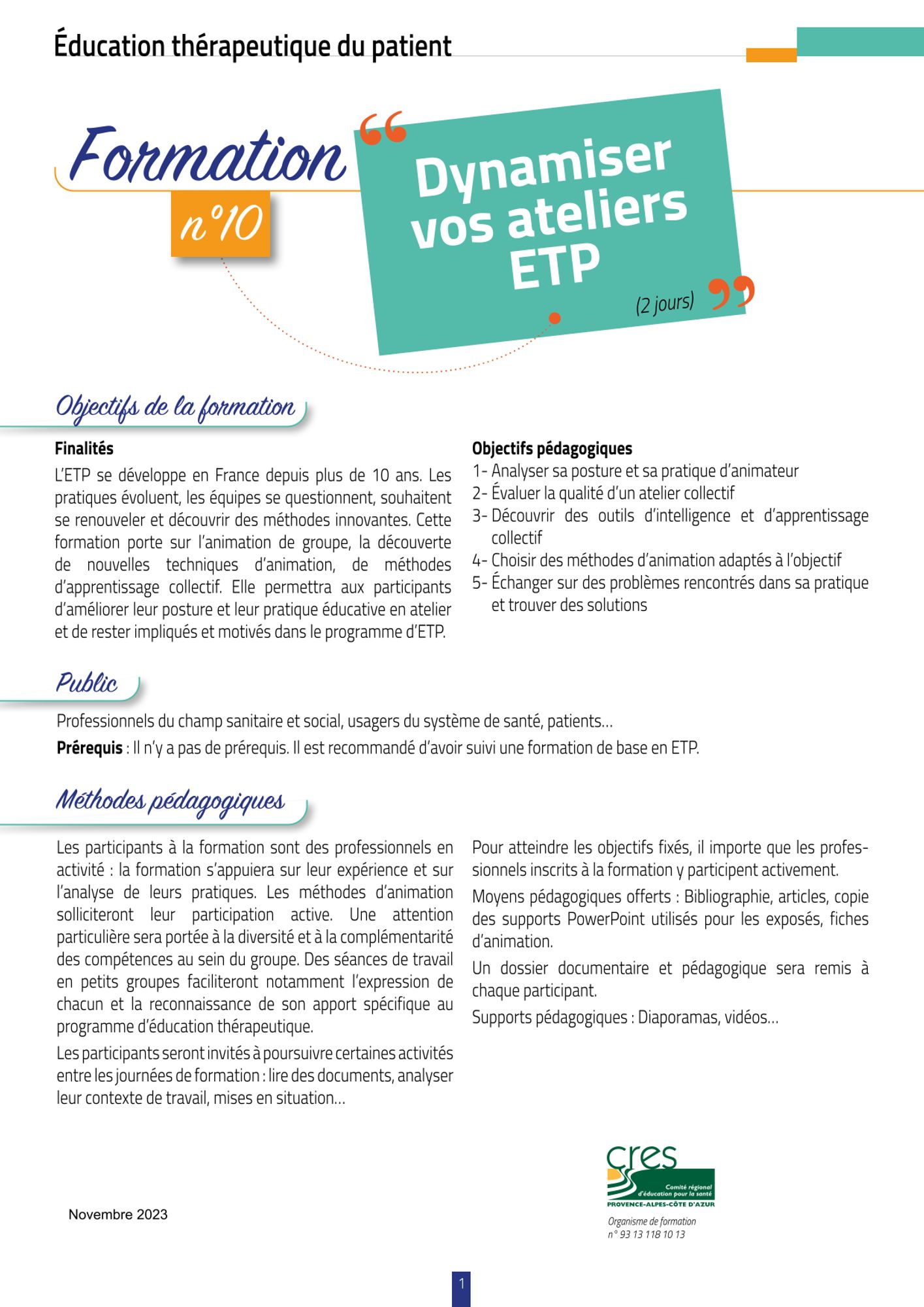 L’ETP se développe en France depuis plus de 10 ans. Les pratiques évoluent, les équipes se questionnent, souhaitent se renouveler et découvrir des méthodes innovantes. Cette formation porte sur l’animation de groupe, la découverte de nouvelles techniques d’animation, de méthodes d’apprentissage collectif. Elle permettra aux participants d’améliorer leur posture et leur pratique éducative en atelier et de rester impliqués et motivés dans le programme d’ETP.
