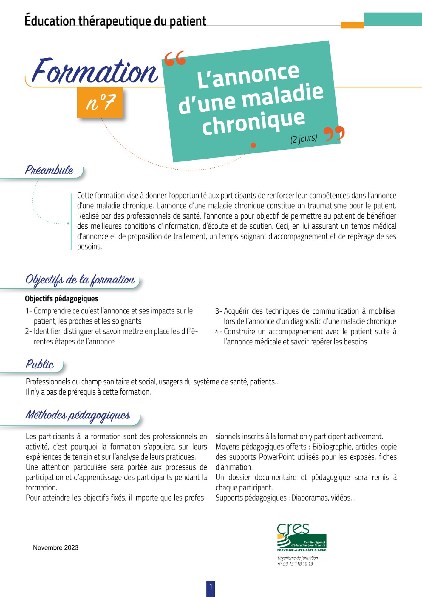 Cette formation vise à donner l’opportunité aux participants de renforcer leurs compétences dans l’annonce d’une maladie chronique, qui constitue un traumatisme pour le patient. Réalisée par des professionnels de santé, l’annonce a pour objectif de permettre au patient de bénéficier des meilleures conditions d’information, d’écoute et de soutien.