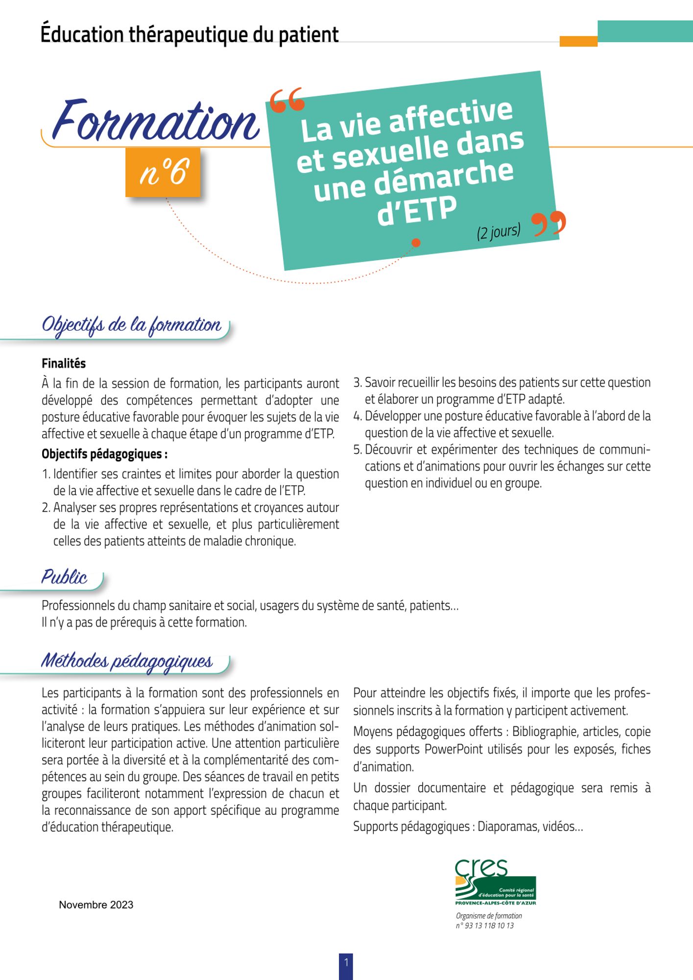 À la fin de la session de formation, les participants auront développé des compétences permettant d’adopter une posture éducative favorable pour évoquer les sujets de la vie affective et sexuelle à chaque étape d’un programme d’ETP.