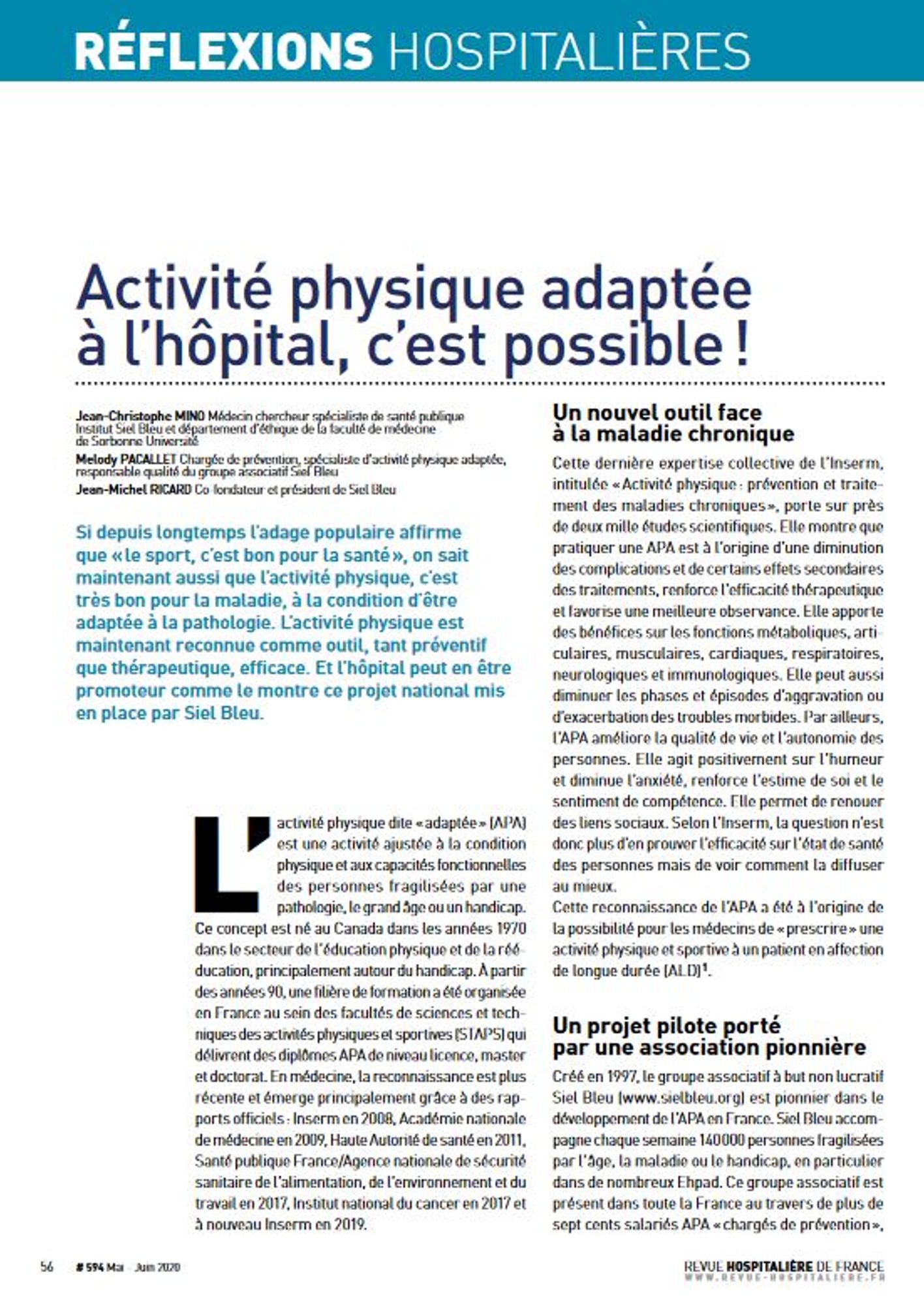 MINO Jean-Christophe, PACALLET Melody, RICARD Jean-Michel, Revue hospitalière de France, n° 594, 2020-05, pp. 56-59