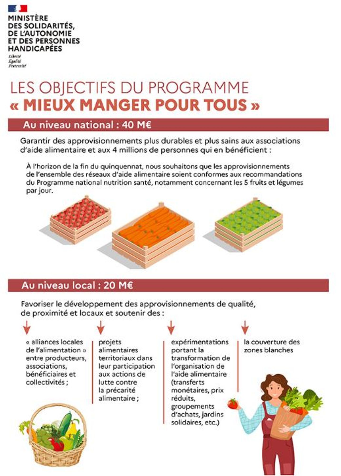 Face aux conséquences de l’inflation, le Gouvernement intensifie la lutte contre la précarité alimentaire. Jean-Christophe Combe, ministre des Solidarités, de l’Autonomie et des Personnes handicapées, a lancé le programme « Mieux manger pour tous » qui comprend un volet national (40 millions d’euros) et un volet local (20 millions d’euros).