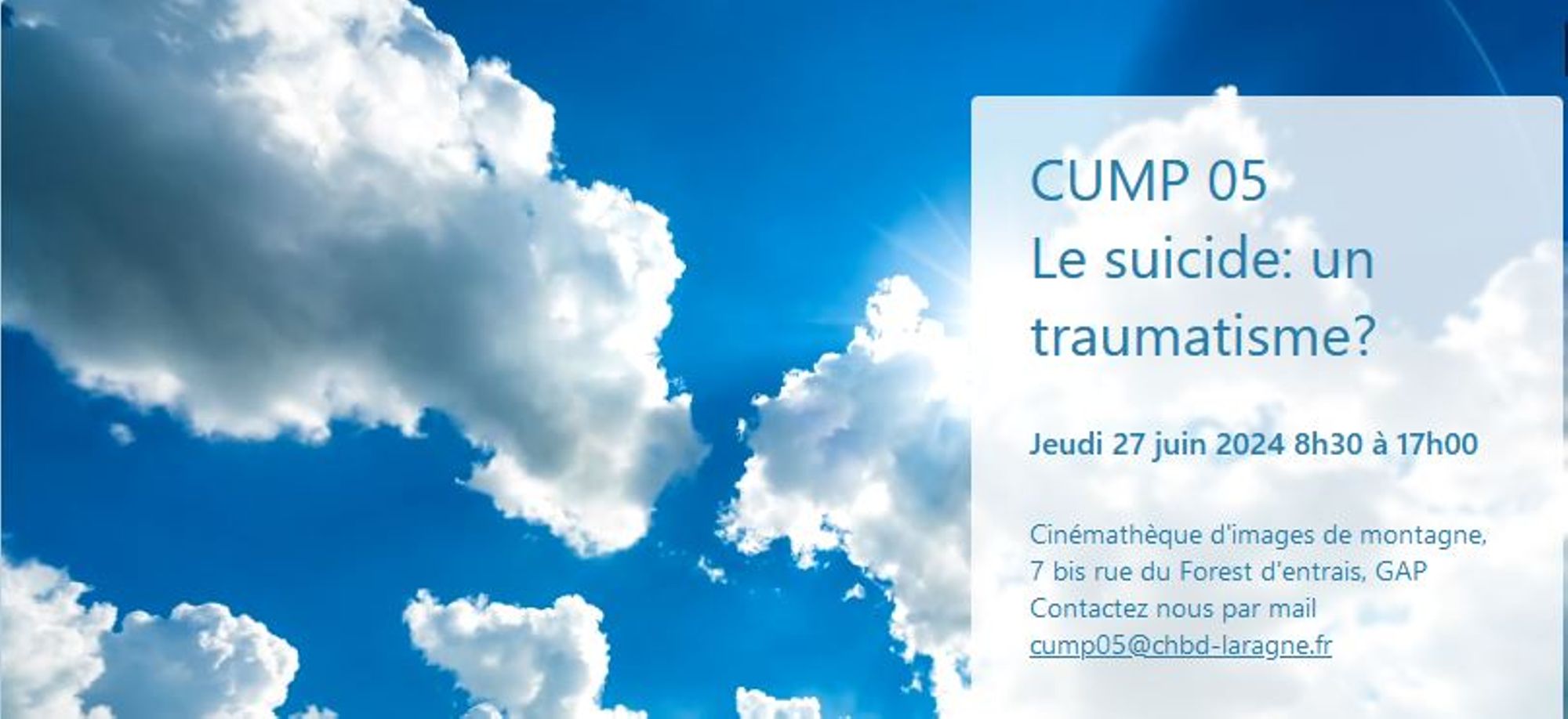 Cette journée organisée par la Cellule d’Urgence Médico-Psychologique des Hautes-Alpes s’adresse à toutes les personnes qui interviennent quotidiennement sur des situations de crises, soignants, pompiers, gendarmes, personnels de santé (services d’urgences, psychiatrie, maison des adolescents).