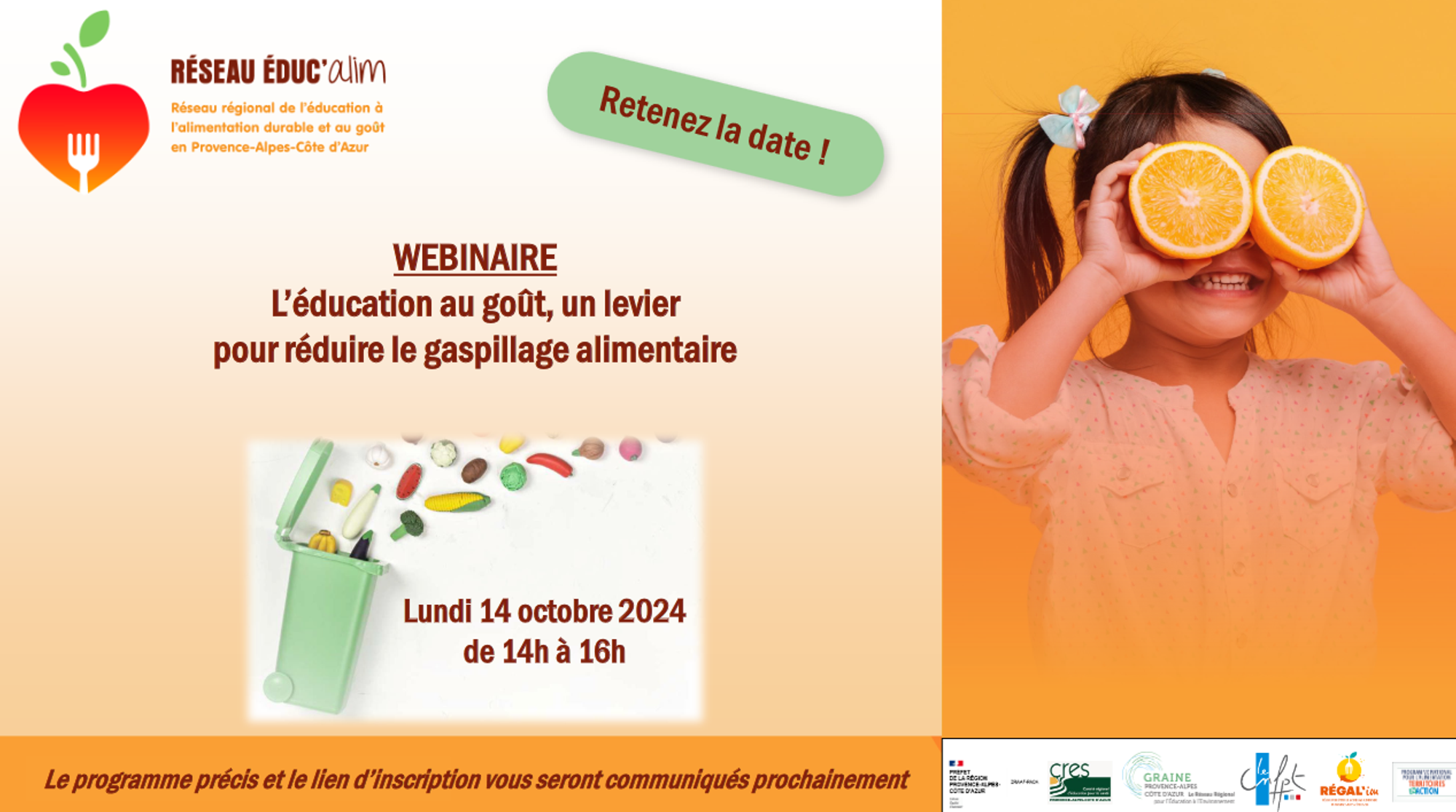 Dans le cadre du Réseau EDUC’Alim (le réseau régional de l’Education à l’alimentation durable et au goût en région Provence-Alpes-Côte d’Azur), un webinaire est proposé le 14 octobre 2024 de 14h à 16h, sur le thème « L’éducation au goût, un levier pour réduire le gaspillage alimentaire ».
