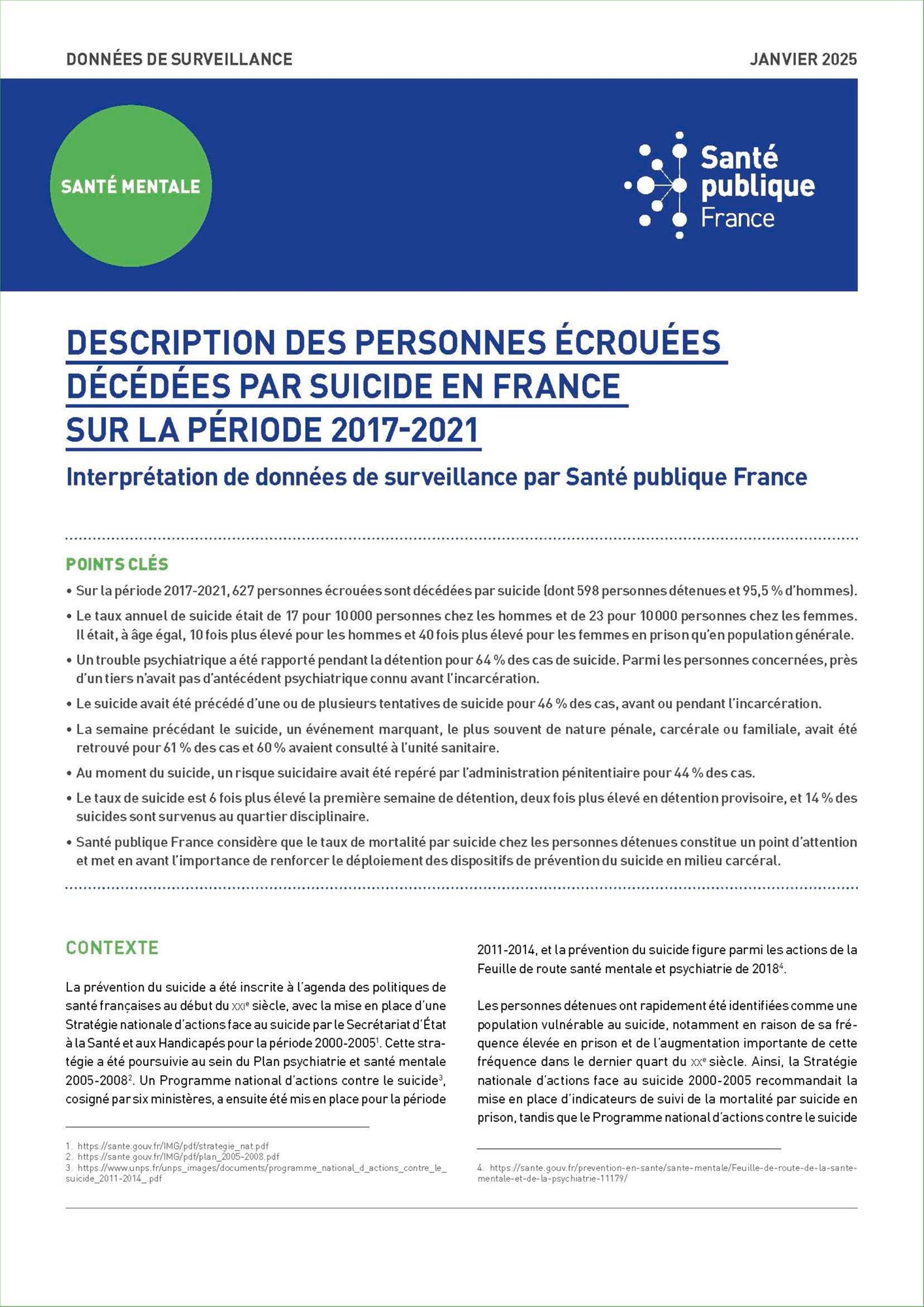 Dans le cadre des politiques de santé publique, la Direction générale de la santé (DGS) du ministère de la santé a sollicité Santé publique France pour mettre en place une étude épidémiologique visant à décrire les suicides parmi les personnes écrouées. Santé publique France considère que le taux de mortalité par suicide chez les personnes détenues constitue un point d'attention et met en avant l'importance de renforcer le déploiement des dispositifs de prévention du suicide en milieu carcéral.ne version détaillée des résultats pourra être retrouvée dans une thèse de santé publique intitulée « Le suicide des personnes détenues en France : état des lieux, facteurs de risque et enjeux pour la prévention », soutenue le 8 octobre 2024.