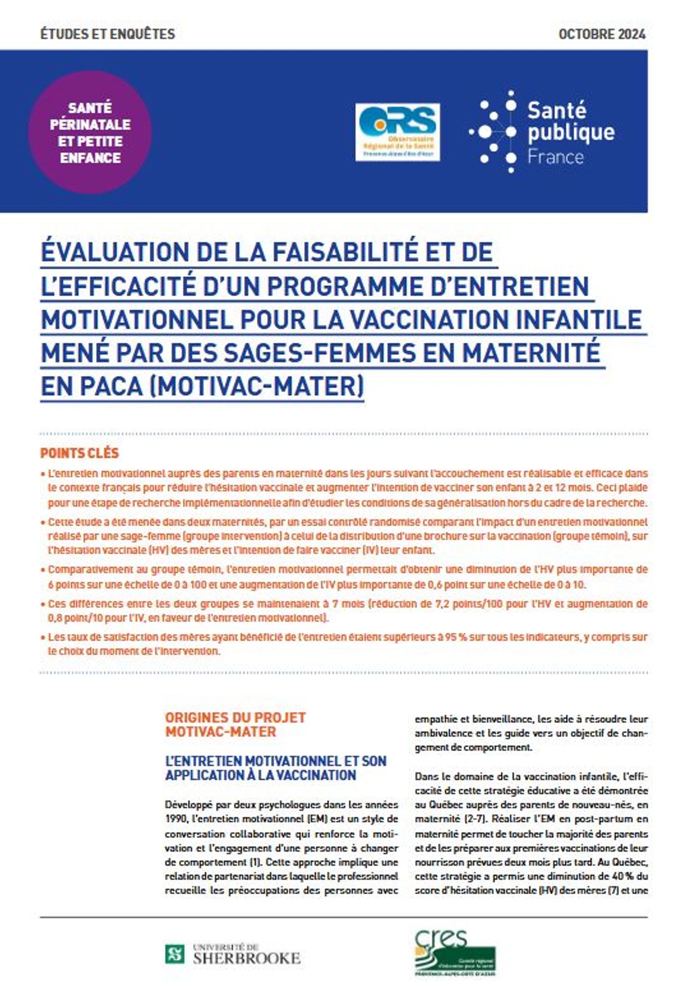 Cette étude est consacrée aux résultats de l'évaluation de la faisabilité et de l'efficacité du programme MOTIVAC-MATER mené de novembre 2021 à avril 2022 dans plusieurs maternités de la région. Ce programme vise, par l'entretien motivationnel auprès des mères et parents mené par une sage-femme dans les jours suivant l'accouchement, à réduire l'hésitation vaccinale et à augmenter l'intention de vacciner les nourrissons de 2 à 12 mois. L’influence et le maintien dans le temps d’une intervention basée sur I’entretien motivationnel sur l’hésitation vaccinale et l’intention vaccinale des mères, la comparabilité avec les niveaux d’impact des études initiales québécoises, la réduction apparente des inégalités sociales dans l’acceptation des vaccins, et la satisfaction des parents sur plusieurs aspects du programme plaident pour une pratique à plus grande échelle de cette intervention.