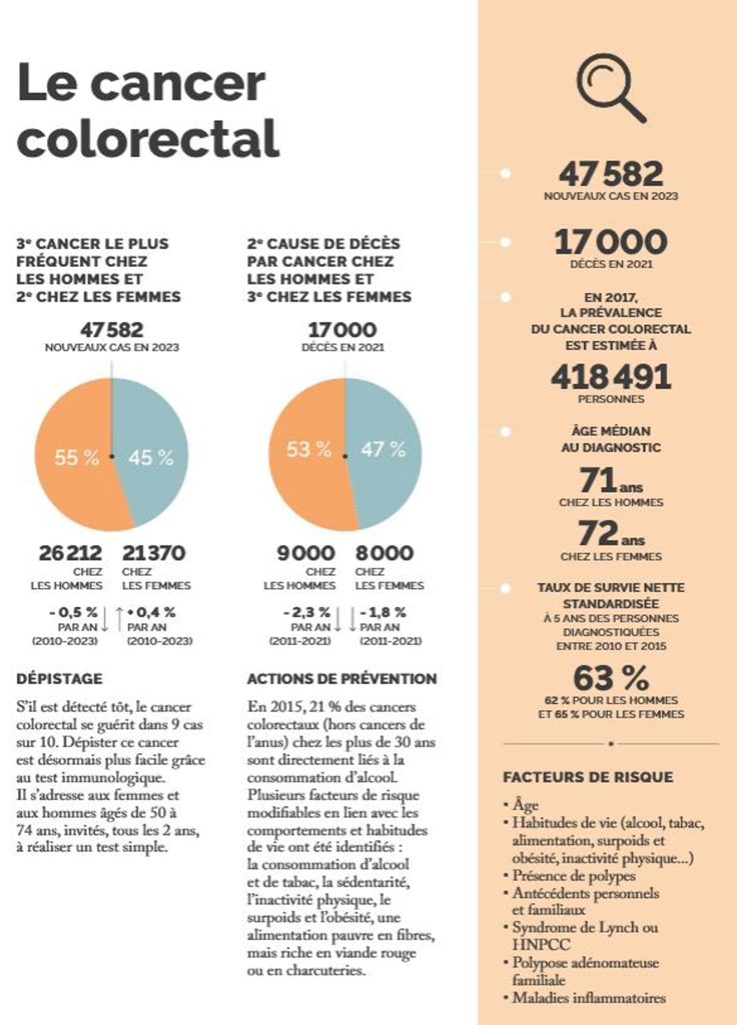 Le cancer colorectal, ou cancer du côlon et du rectum, est l’un des plus fréquents en France. Il touche chaque année plus de 47 000 personnes et cause 17 000 décès. Dans plus de 80 % des cas, il provient d’une tumeur bénigne qui évolue lentement et finit par devenir cancéreuse. Rappel de données épidémiologiques sur le cancer colo-rectal par l'Institut national du cancer (INCa).