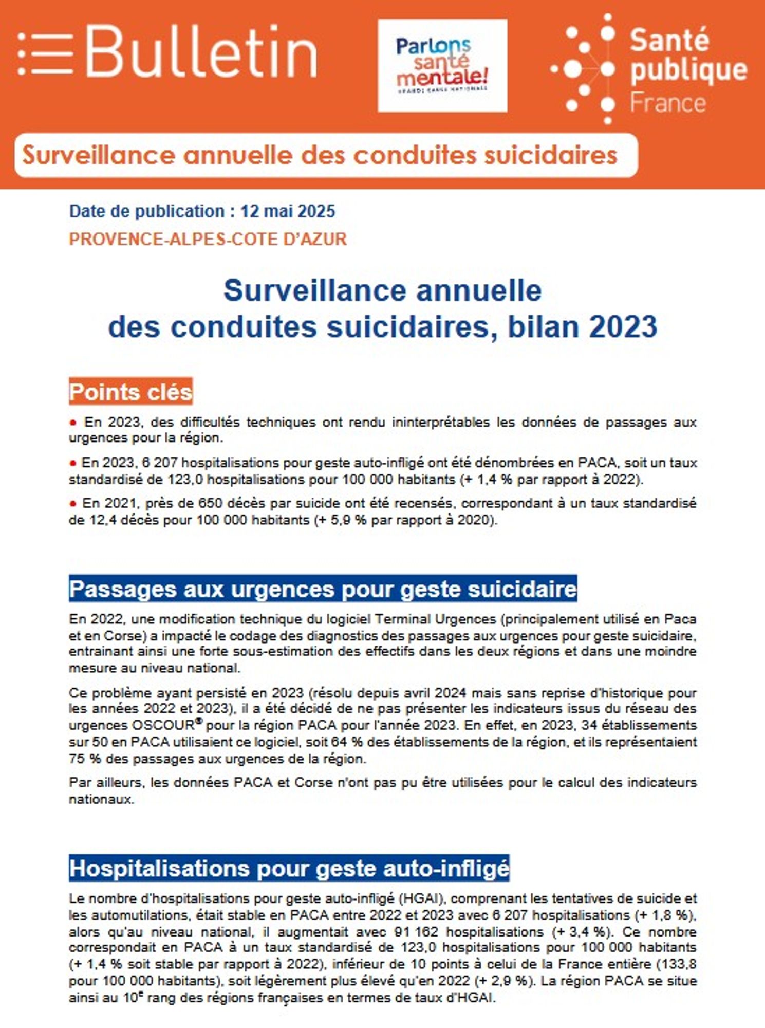 En 2023, des difficultés techniques ont rendu ininterprétables les données de passages aux urgences pour la région. En 2023, 6 207 hospitalisations pour geste auto-infligé ont été dénombrées en PACA, soit un taux standardisé de 123,0 hospitalisations pour 100 000 habitants (+ 1,4 % par rapport à 2022). En 2021, près de 650 décès par suicide ont été recensés, correspondant à un taux standardisé de 12,4 décès pour 100 000 habitants (+ 5,9 % par rapport à 2020).