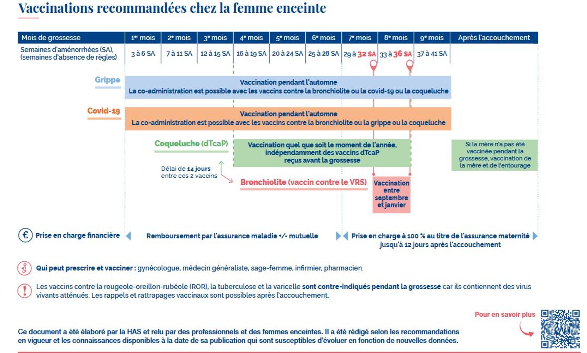 Cet outil de la HAS permet de visualiser quels sont les 4 vaccins recommandés pour une femme enceinte (grippe, la covid-19, la coqueluche et la bronchiolite) et à quel moment elle doit se faire vacciner pour sa santé et celle de son enfant à naître. Plusieurs professionnels de santé peuvent les prescrire et les faire : gynécologue, sage-femme, médecin traitant, infirmier ou pharmacien.