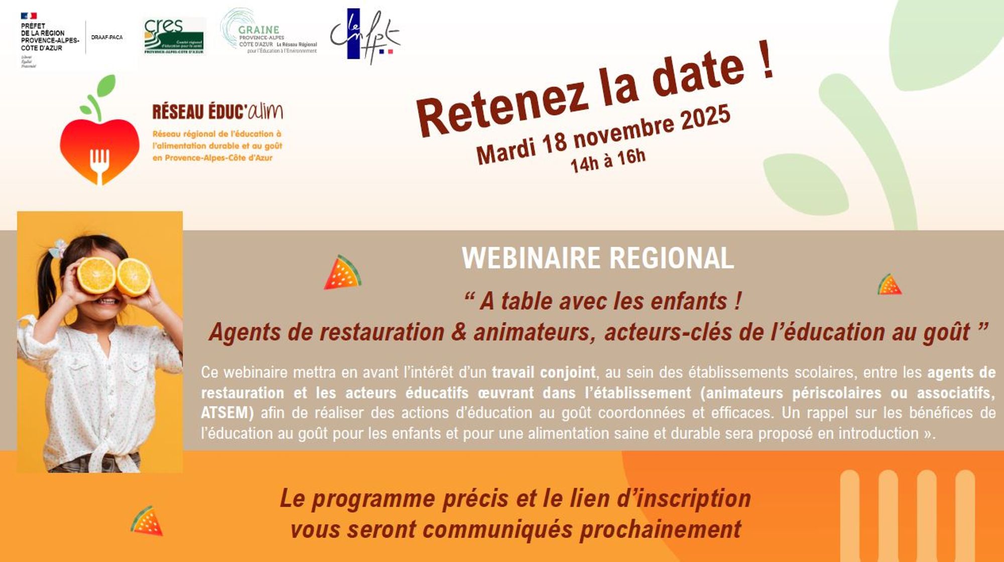 Le prochain webinaire du réseau EDUC’alim « A table avec les enfants ! Agents de restauration et animateurs, acteurs-clés de l’éducation au goût » , se tiendra le 18 novembre 2025 de 14h à 16h.