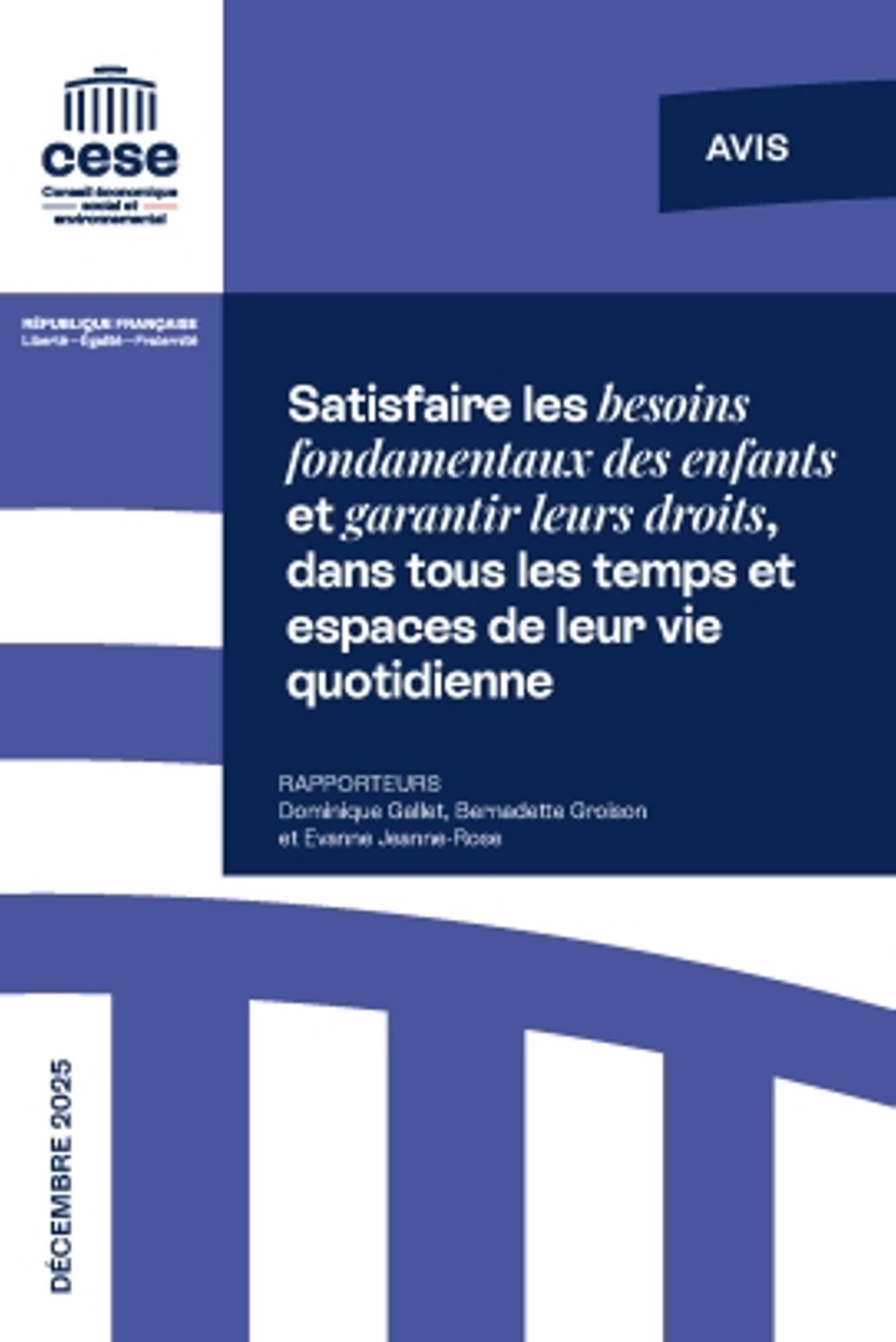 Le Cese, pilote de la convention citoyenne sur les temps de l’enfant, formule 19 propositions pour lui apporter "des temps de vie de qualité dans sa famille, à l’école et dans tous les lieux tiers", dans cet avis, les auteurs insistent sur quatre besoins fondamentaux : la protection (contre toutes formes de violence) ; la santé (soins, prévention, environnement sain) ; l'éducation et développement (accès à une éducation de qualité, soutien aux apprentissages) ; le bien-être et la participation (sécurité affective, loisirs, droit d’expression et de participation aux décisions qui les concernent).