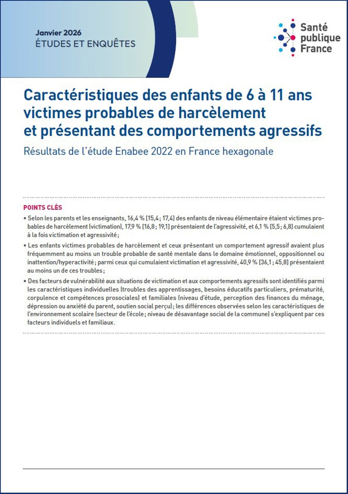 Santé publique France a publié de nouveaux résultats d’Enabee, première enquête épidémiologique nationale sur le bien-être et la santé mentale des enfants scolarisés en maternelle ou en élémentaire en France hexagonale. L’objectif de cette publication, portant sur les enfants scolarisés en élémentaire uniquement, est de décrire les facteurs de vulnérabilité des enfants impliqués dans différentes situations de type harcèlement.