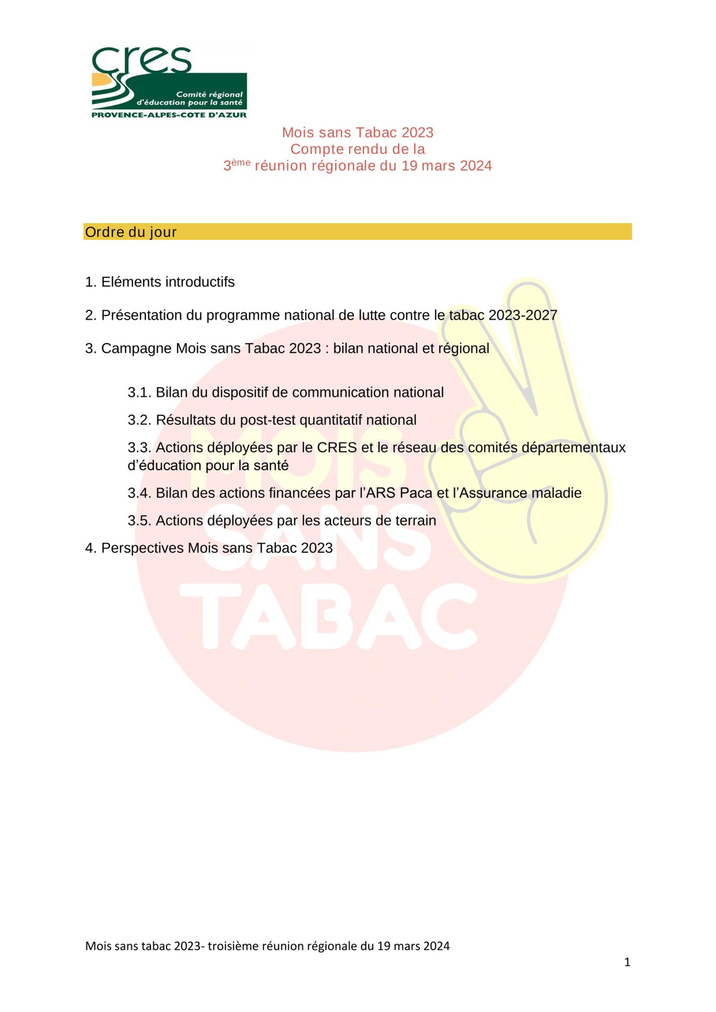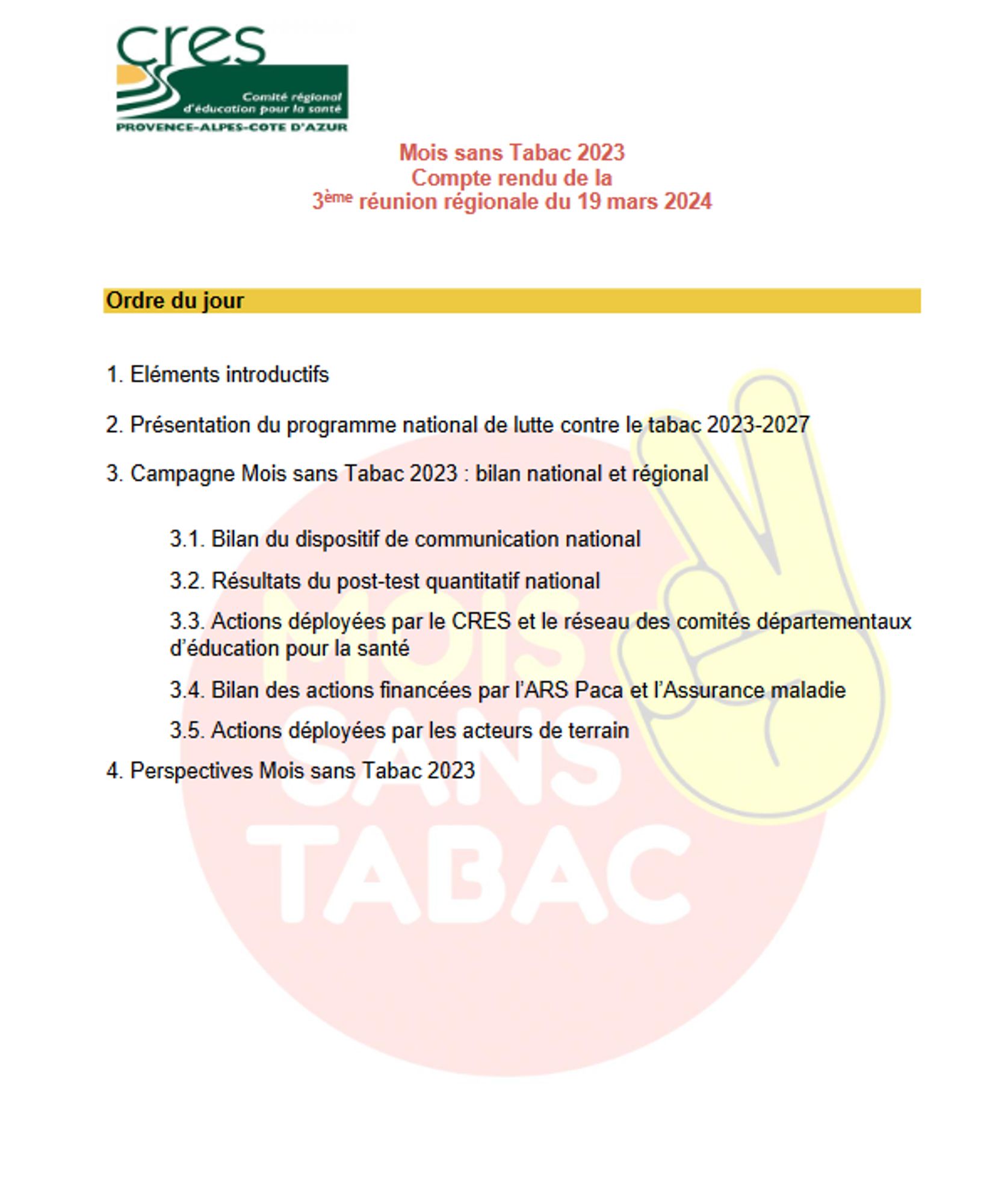 Le compte-rendu du copil du 19 mars 2024, 3ème réunion régionale de bilan pour le Mois sans tabac 2023 organisée en partenariat avec l'ARS PACA, est disponible.
