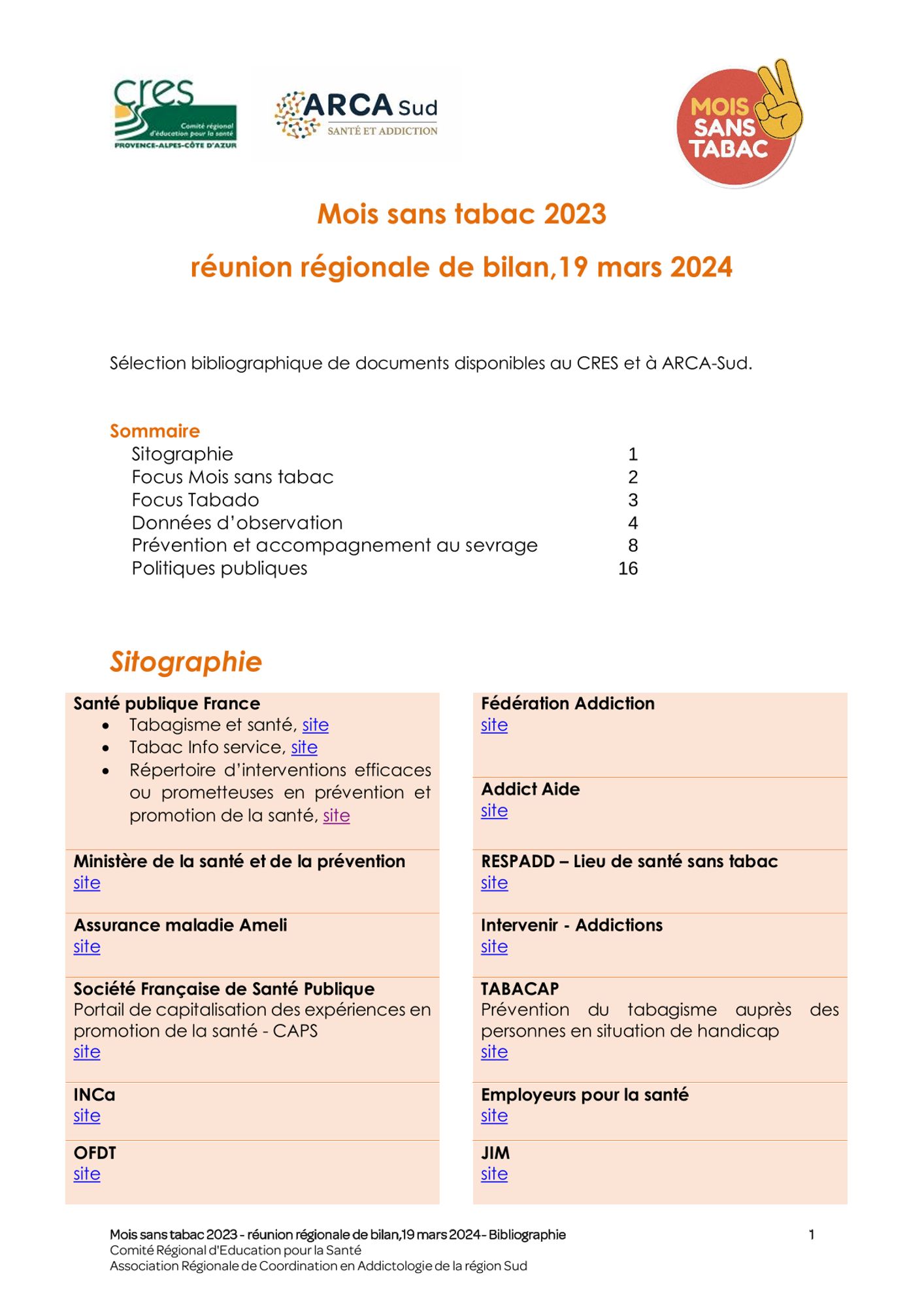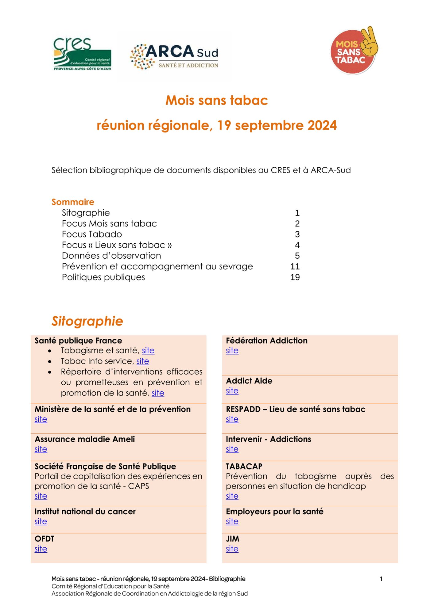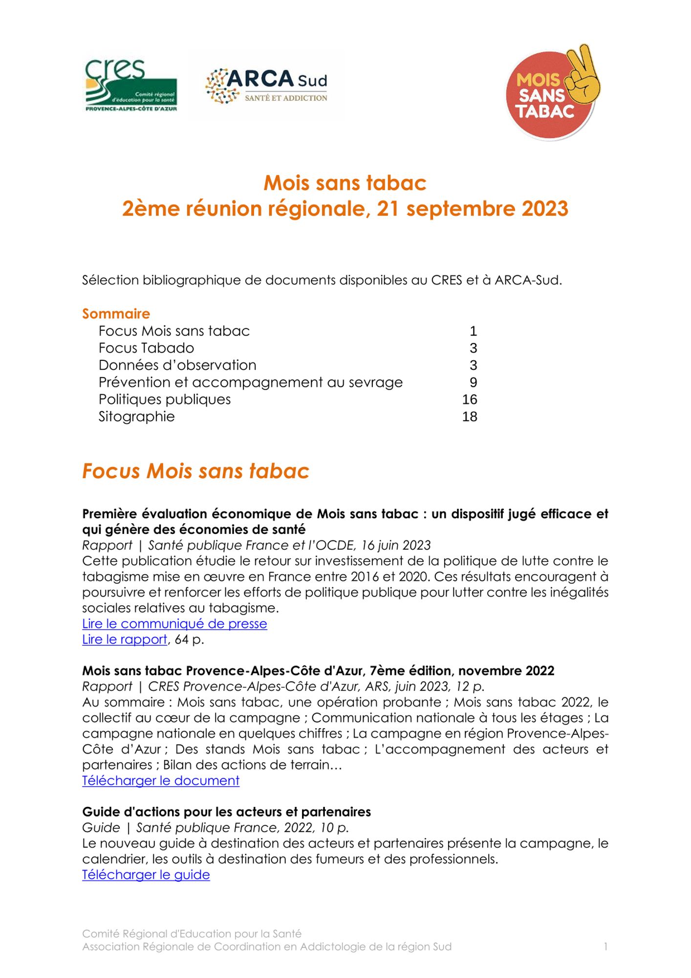 Les sélections bibliographiques réalisées à l'occasion de l'organisation de chaque comité de pilotage régional de Mois sans tabac par notre partenaire Arca-Sud :