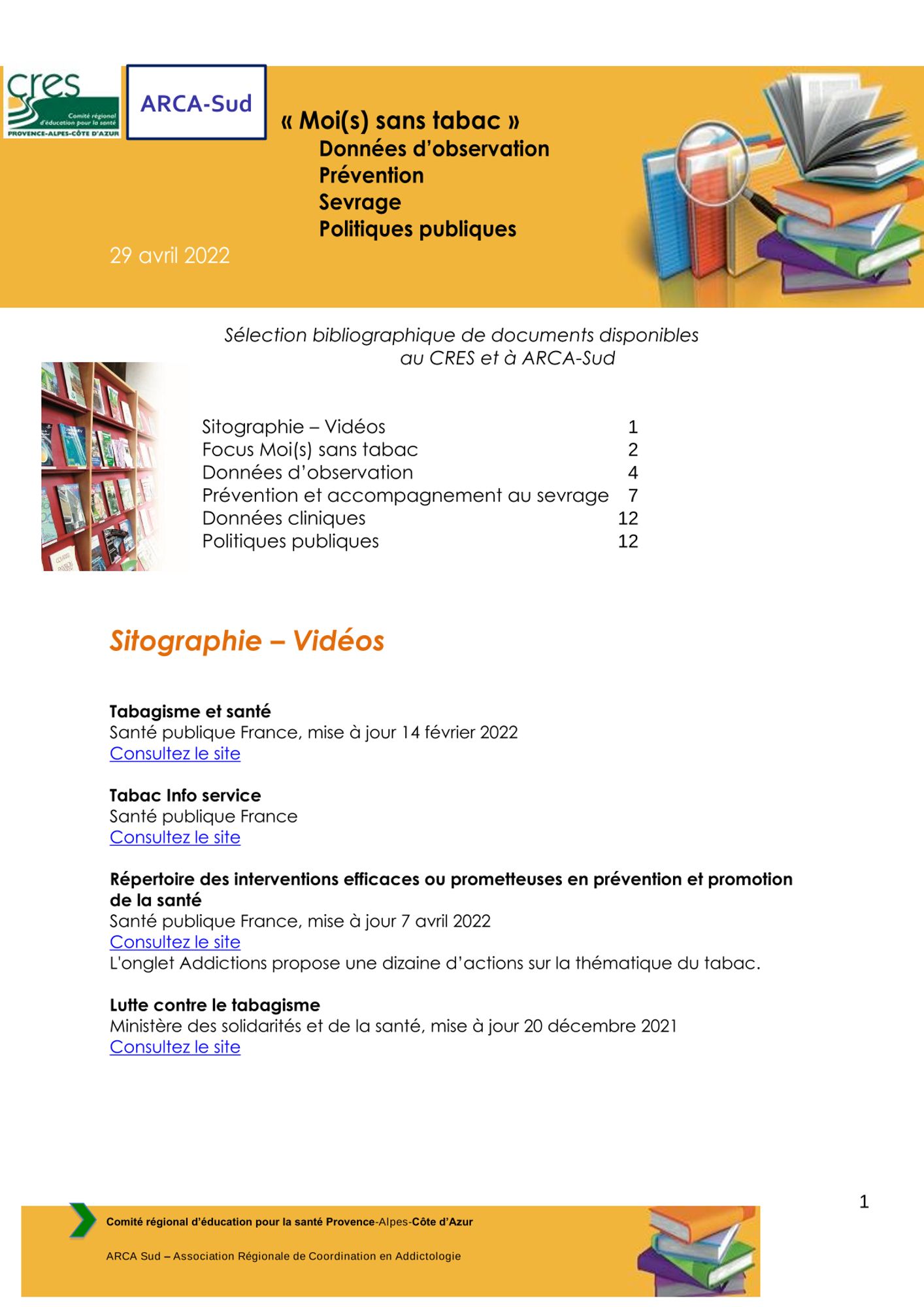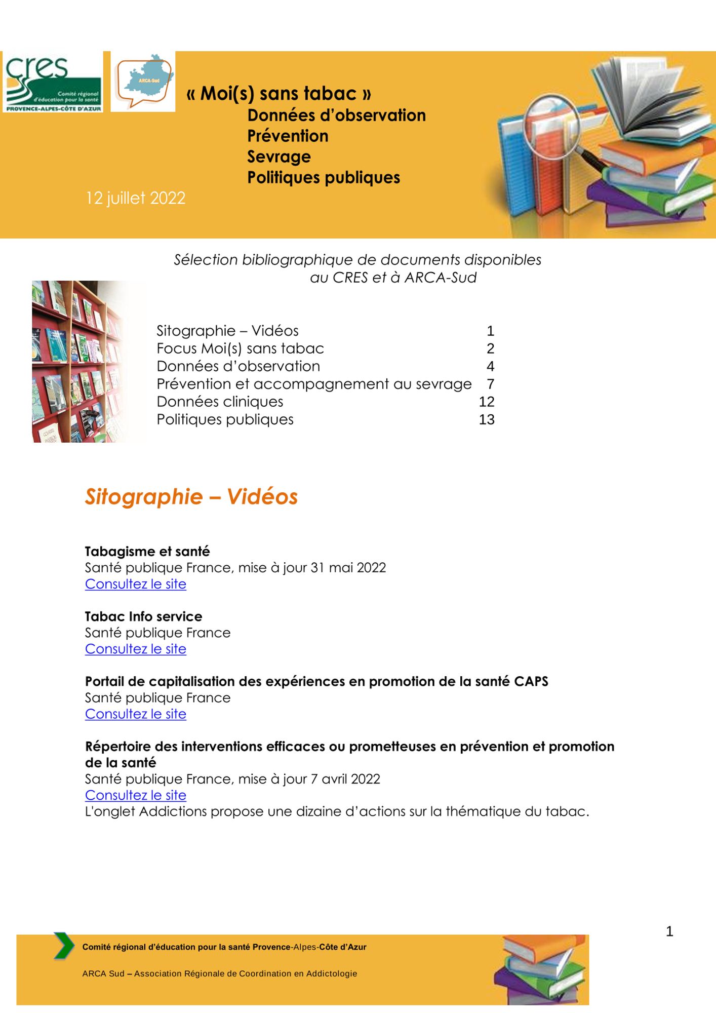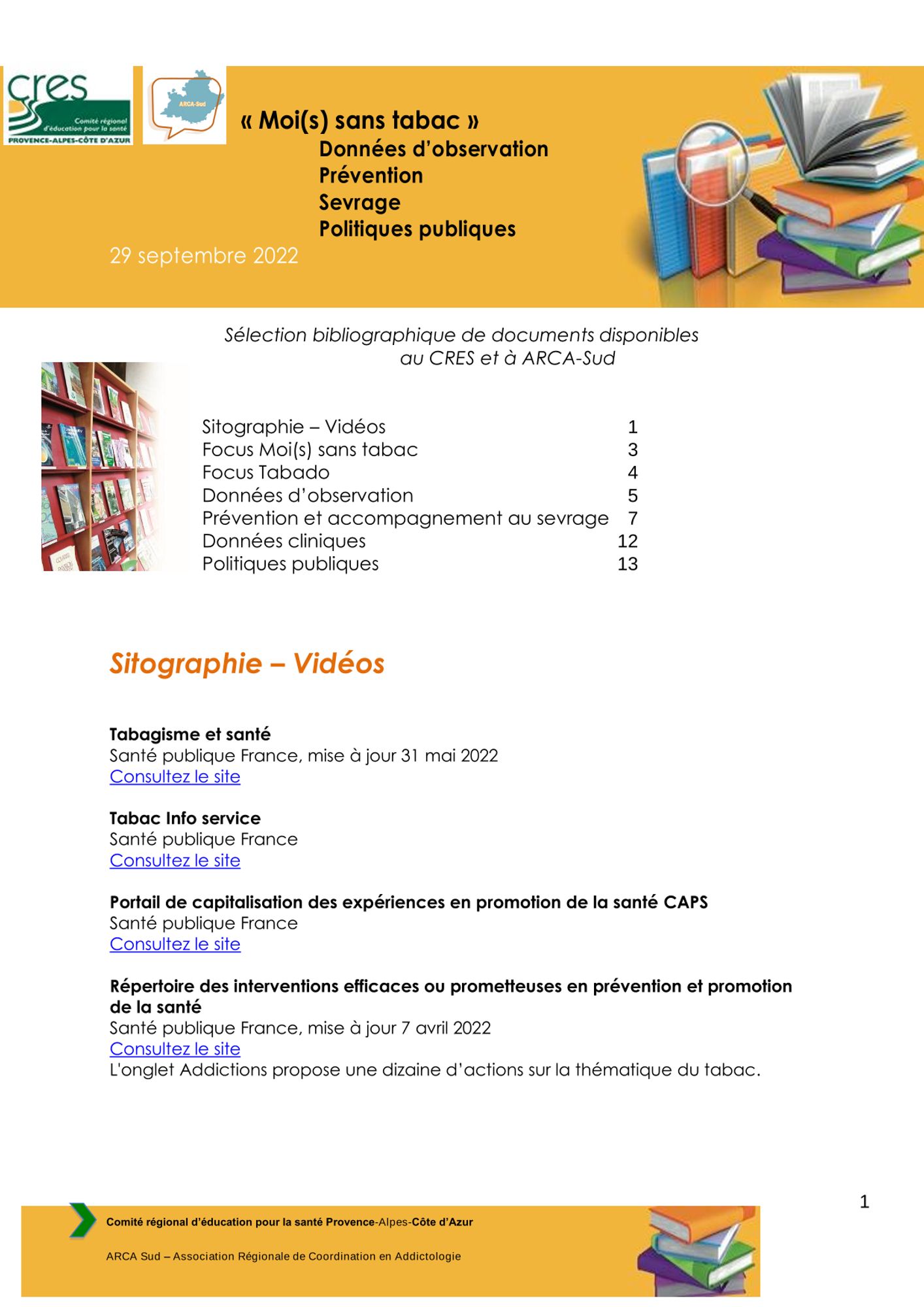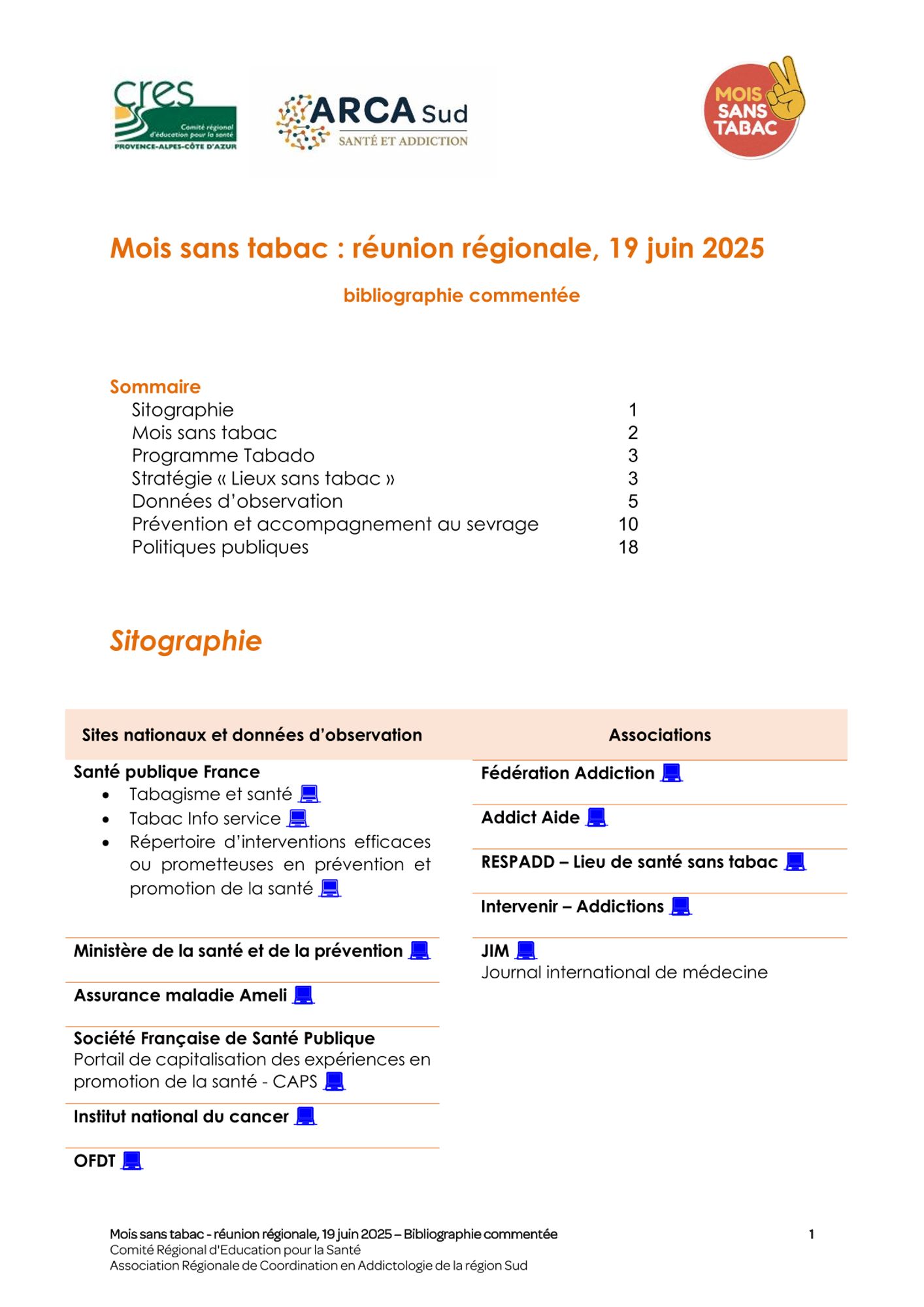 Les sélections bibliographiques réalisées à l'occasion de l'organisation de chaque comité de pilotage régional de Mois sans tabac par notre partenaire Arca-Sud :