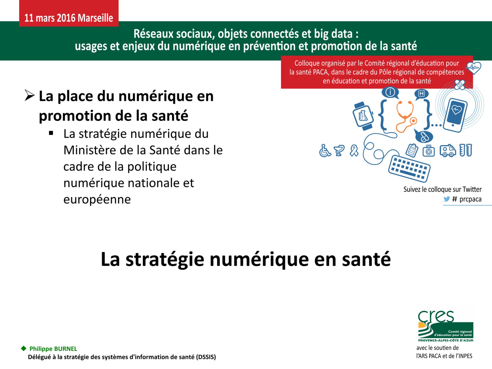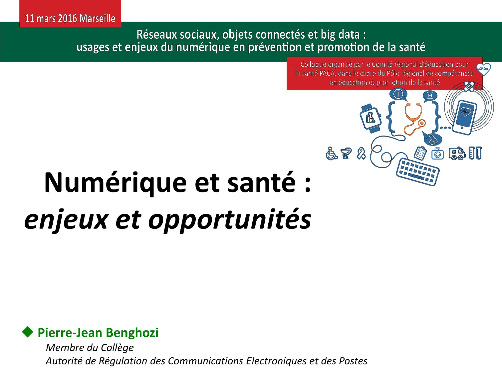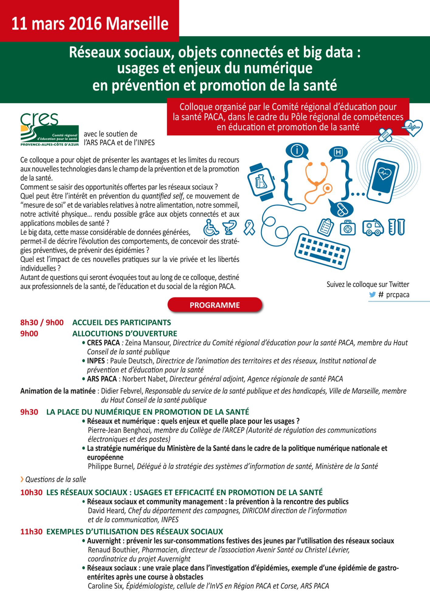 "Réseaux sociaux, objets connectés et big data : usages et enjeux du numérique en prévention et promotion de la santé" est le thème du colloque qu'a organisé le CRES PACA le 11 mars 2016 à Marseille, dans le cadre du pôle régional de compétences en éducation et promotion de la santé.