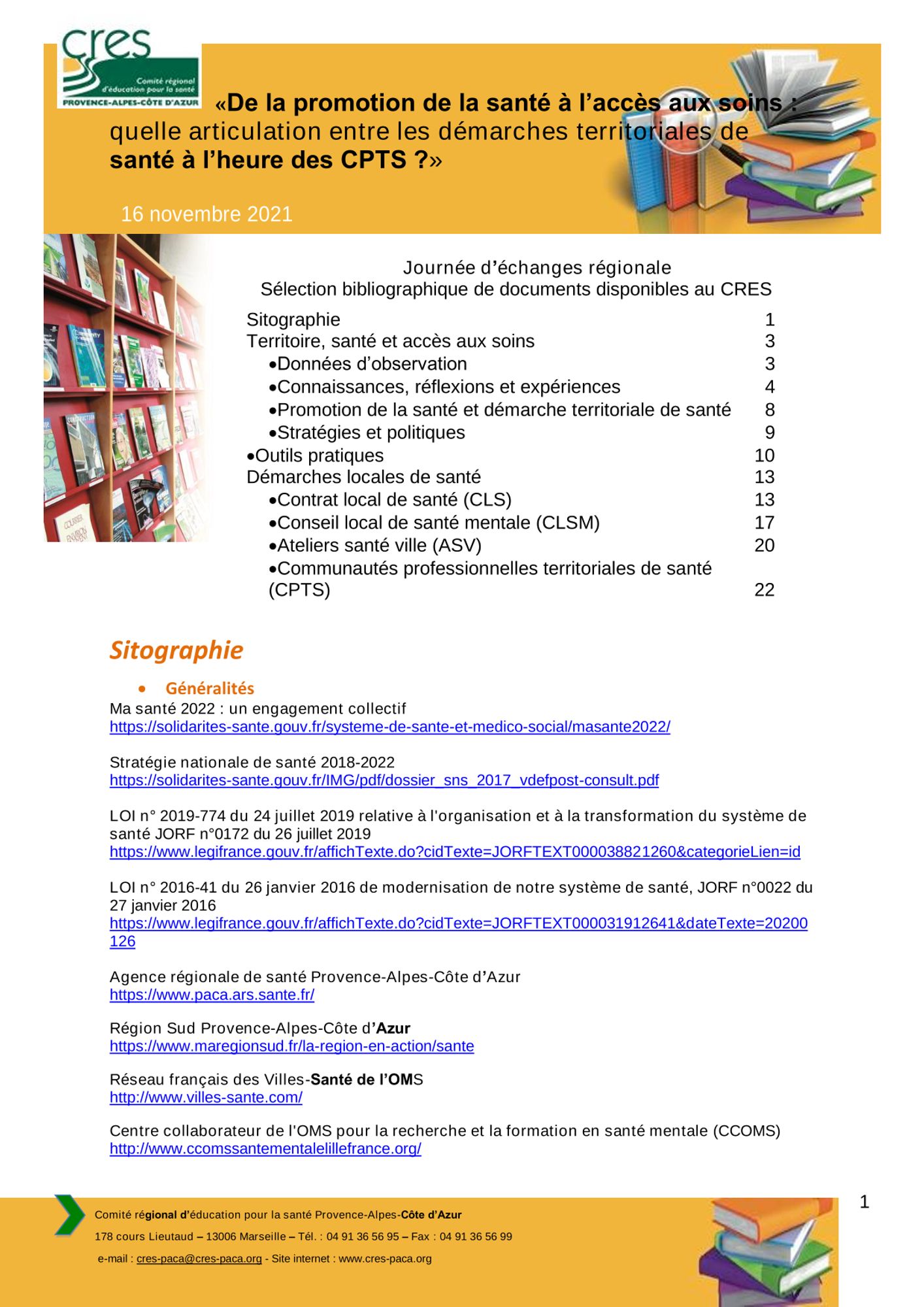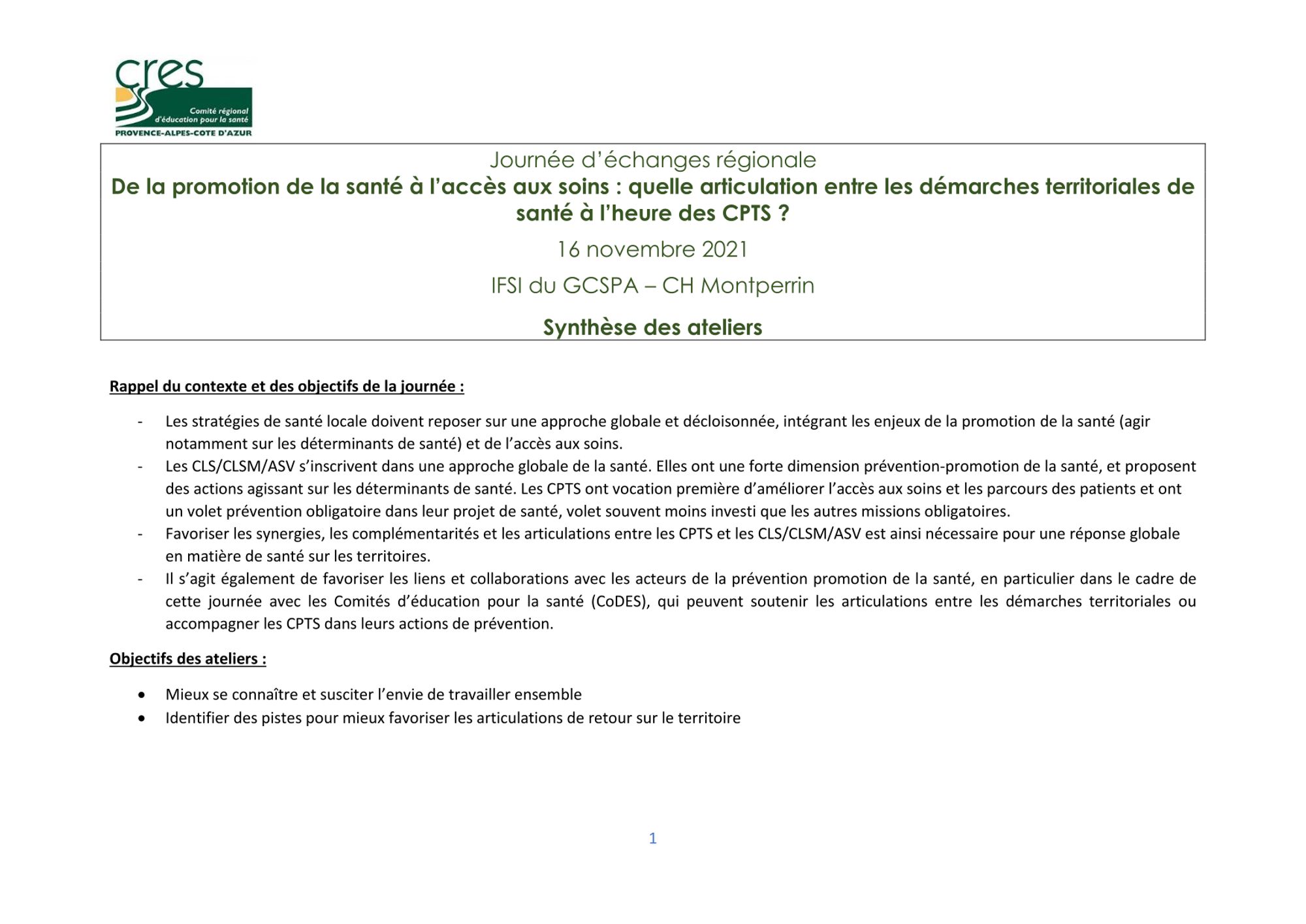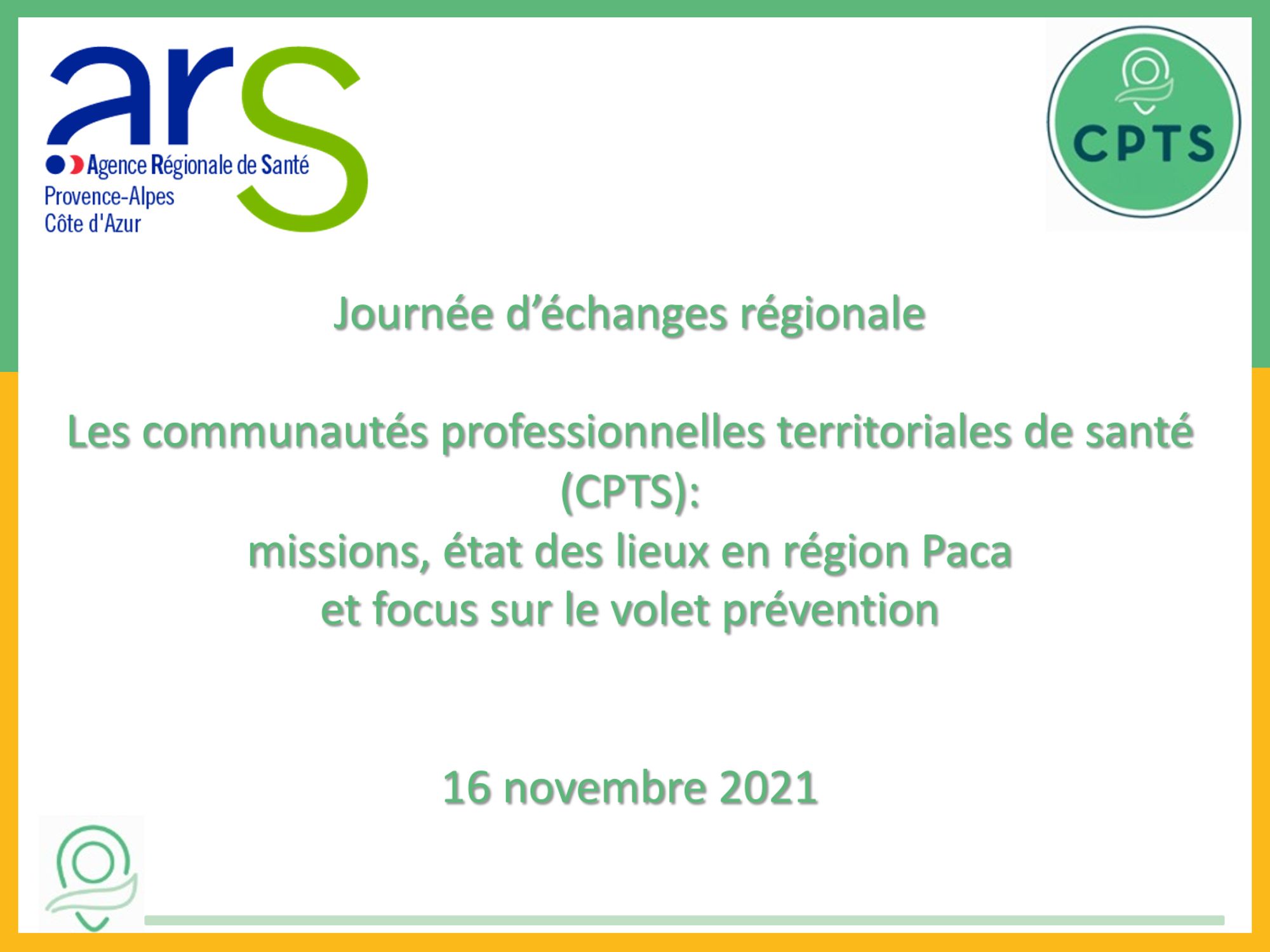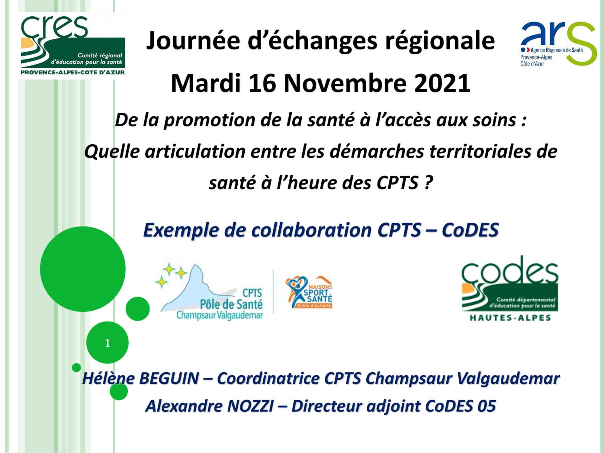 Le CRES a proposé le 16 novembre 2021, en lien avec l’ARS Provence-Alpes-Côte d'Azur et l’Assurance Maladie, une journée d’échanges régionale visant à favoriser les liens et articulations entre les communautés professionnelles territoriales de santé (CPTS), les ateliers santé ville (ASV), les contrats locaux de santé (CLS), les conseils locaux de santé mentale (CLSM) et les acteurs du champ de la prévention-promotion de la santé, en particulier les comités départementaux d’éducation pour la santé (CoDES).