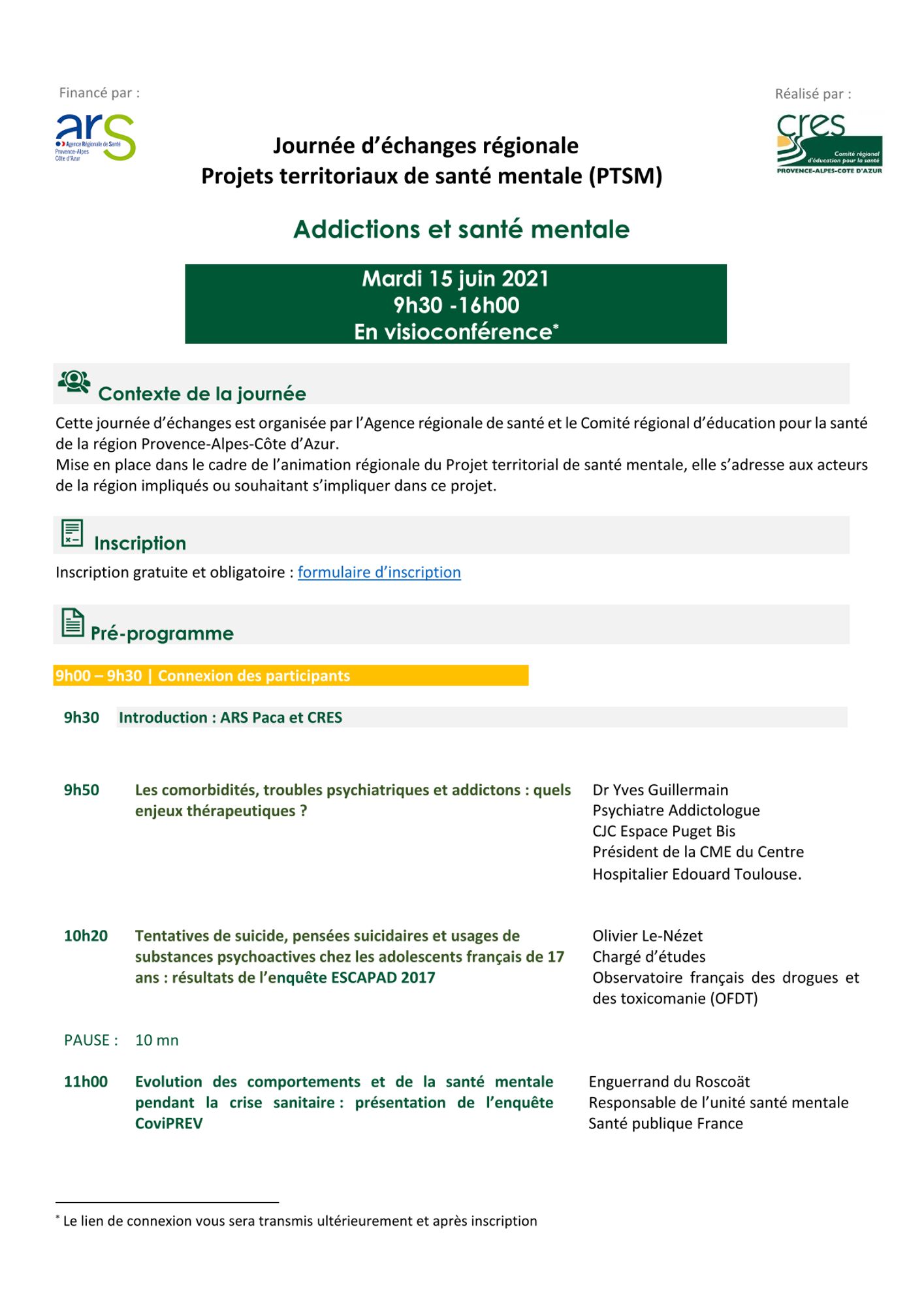 Le CRES a organisé, en lien avec l’ARS PACA, une journée d’échanges régionale sur le thème "Addictions et santé mentale", le 15 juin 2021. Cette journée s’adressait à tous les acteurs concernés et engagés dans la mise en œuvre des PTSM de la région.