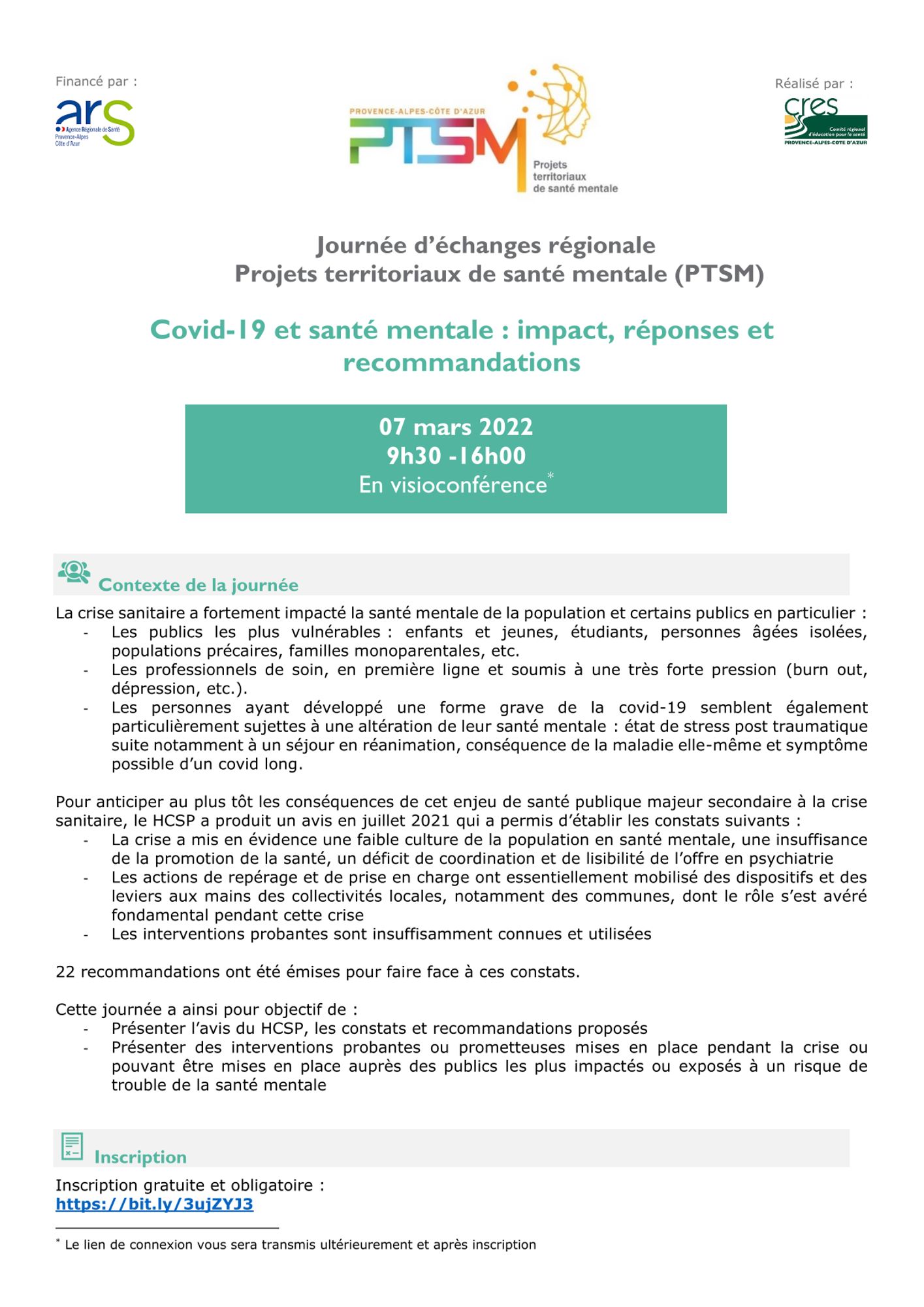 Dans le cadre de l'animation régionale des Projets territoiraux de santé mentale (PTSM), le CRES a organisé, en partenariat avec l'ARS PACA, une journée régionale sur le thème "Covid-19 et santé mentale", le 7 mars 2022.