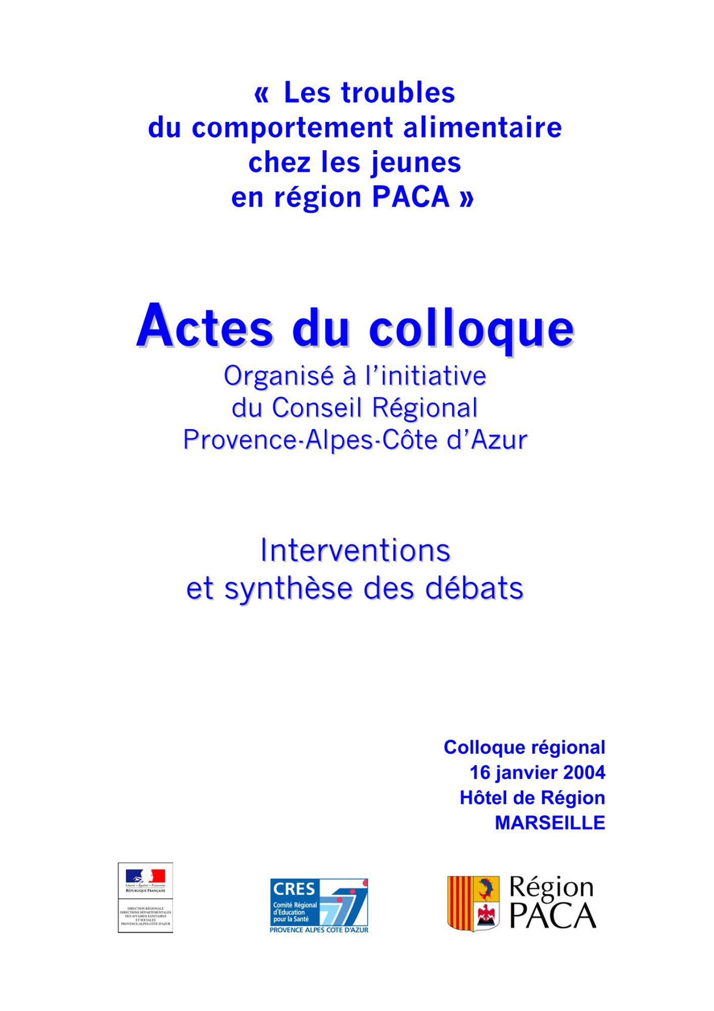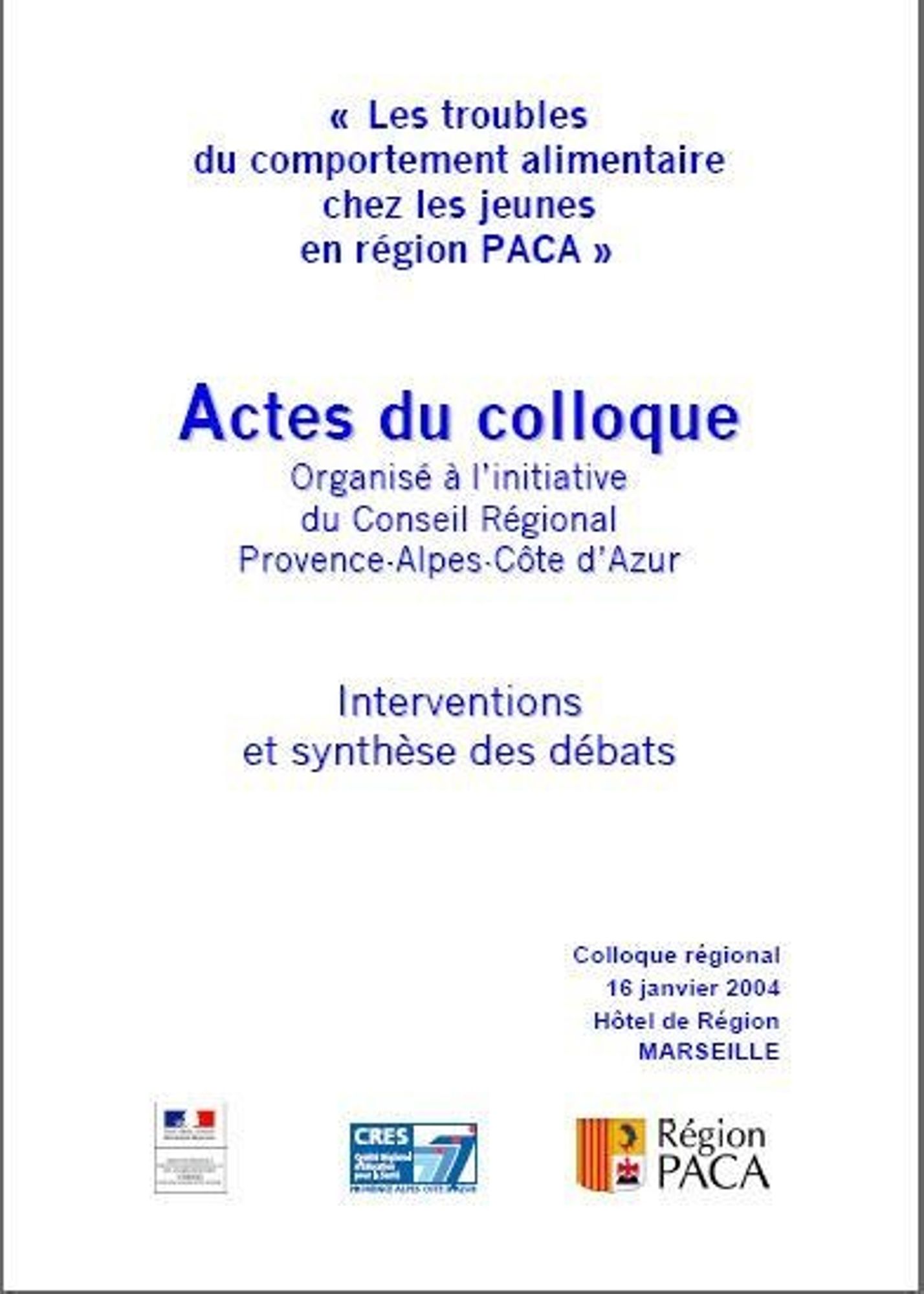 Actes du colloque sur les troubles du comportement alimentaire chez les jeunes en région organisé par le CRES et la Région Paca en janvier 2004.
