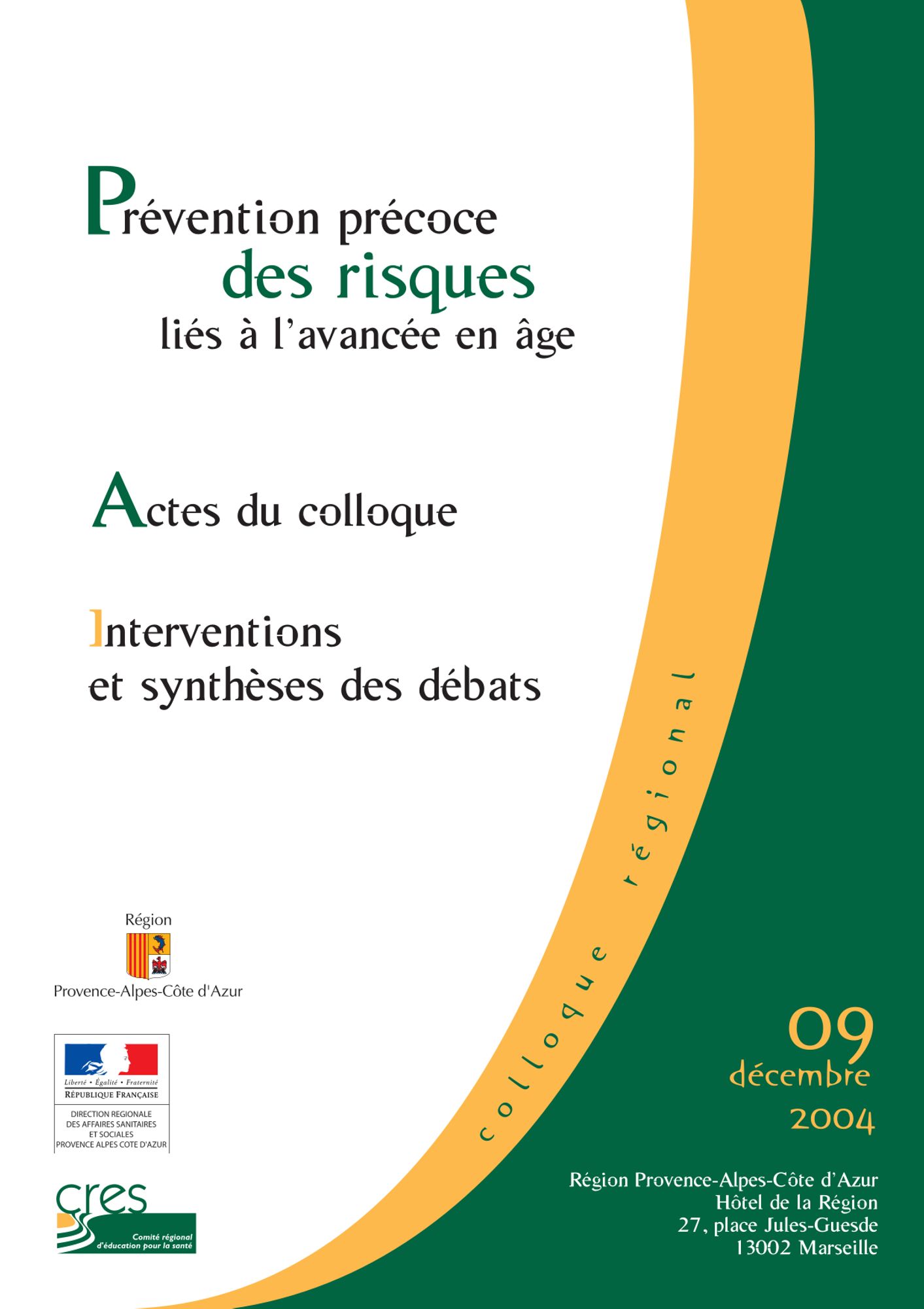 Actes du colloque régional sur la prévention précoce des risques liés à l'avancée en âge organisé par le CRES et la Région Paca en décembre 2004.